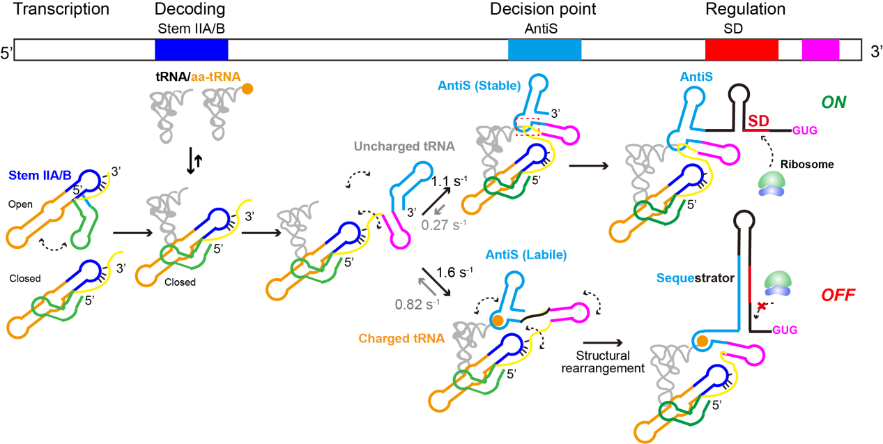 T-box核糖开关是一类重要的基因调控元件,广泛分布于革兰氏阳性菌(包括多种致病菌,如结核杆菌、皮疽诺卡菌等)中。其核心功能是通过识别tRNA 3΄末端的氨酰化状态感知细菌营养水平,进而精准调控相关基因表达,对维持细菌生长平衡至关重要。由于该元件在细菌中普遍存在而在哺乳动物中尚未发现,针对T-box核糖开关的药物设计已成为新型抗生素研发的重要方向。T-box的功能实现高度依赖其三维结构与构象动态特征。尽管科研人员已成功解析多种T-box-tRNA复合物的静态三维结构,但T-box如何精准鉴别不同氨酰化状态的tRNA,并启动后续转录或翻译调控的构象动态机制,长期以来仍是领域内亟待解决的关键科学问题。