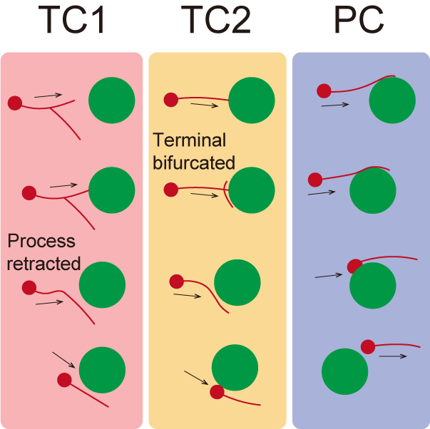 结合活体血管标记技术与IMEE,研究首次实现了对哺乳动物胚胎大脑内神经‑血管‑免疫互作的实时观测。根据抑制性神经元在切向迁移过程中其引导突与血管的接触方式,研究人员区分出两类互作模式:末端接触(Terminal contact,TC)与突起接触(Process contact,PC)。结果表明,末端接触会引发神经元引导突分支收缩或新生,从而改变迁移路径以绕过接触对象;而突起接触则允许神经元沿原方向继续迁移,例如沿血管壁“滑动”。