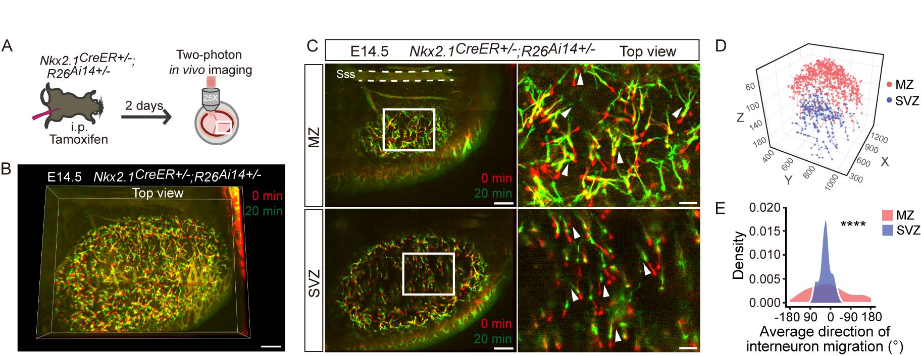 利用不同品系的转基因小鼠内源荧光标记或小鼠胚胎电转技术,研究人员标记了胚胎小鼠大脑皮层内的兴奋性或抑制性神经元,并结合IMEE成像,系统性地鉴定了不同类型神经元的个体与群体迁移模式。结果显示,源于背侧端脑的新生兴奋性神经元通过多极化迁移(Multipolar migration)、位移运动(Locomotion)及胞体转运(Somal translocation)方式在大脑皮层中进行径向迁移;而产生于腹侧端脑的抑制性神经元则分别通过 异质 或同质 方向扩散 模式于 皮层边缘区 (Margina l zone,MZ) 或脑室下区 (Subventricular zone,SVZ)进行切向迁移。