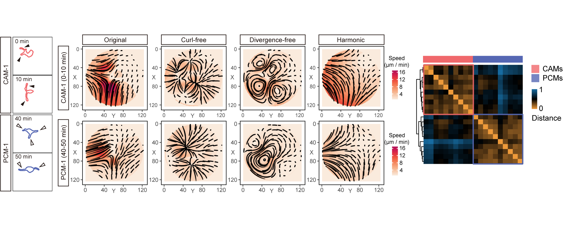 此外,借助IMEE技术,研究人员对Cx3cr1GFP+/-转基因胚胎小鼠大脑皮层中内源荧光标记的小胶质细胞进行了实时观测,并结合细胞形态变化构建向量场,进行了拓扑分解分析。结果显示,静息状态下的毛细血管相关小胶质细胞(Capillary-associated microglia, CAMs)与脑实质小胶质细胞(Parenchymal microglia, PCMs)在环境监视中表现出不同的动态行为模式,其中后者显示出更活跃的细胞突起伸缩运动。