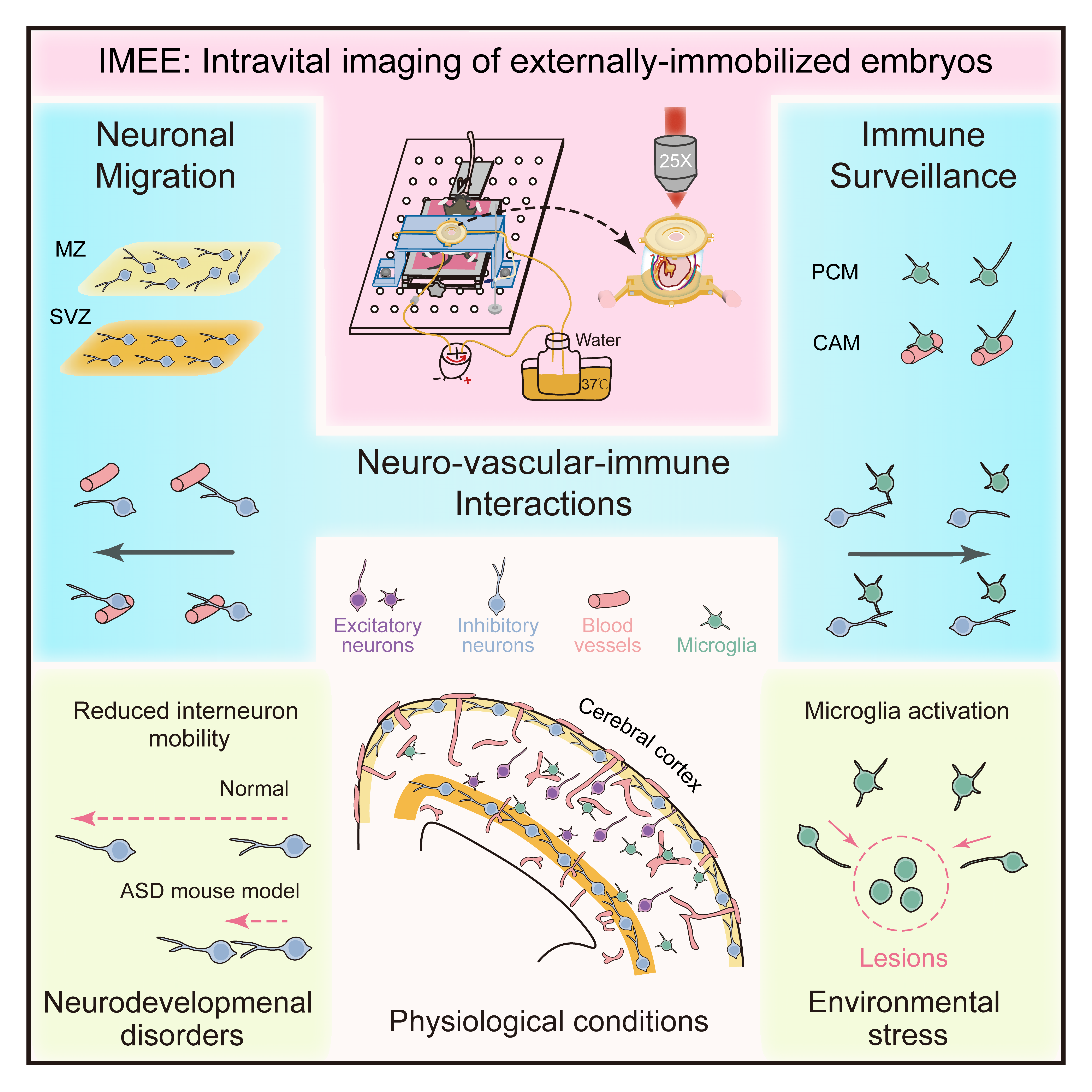 2025年12月16日,清华大学生命科学学院、清华-IDG/麦戈文脑科学研究院、生命科学联合中心、膜生物学全国重点实验室米达团队,与清华大学医学院、清华-IDG/麦戈文脑科学研究院、生命科学联合中心郭增才团队合作,在《细胞》(Cell)发表了题为“哺乳动物发育大脑中神经元与免疫细胞动态的活体观察”(Intravital observation of neuronal and immune cell dynamics in the developing mammalian brain)的研究论文。该研究开发了一种高稳定性、多视角、长时程的胚胎小鼠宫内活体成像技术(IMEE),首次在体阐明了胚胎小鼠大脑皮层内抑制性神经元与血管网络及小胶质细胞间的动态互作模式。研究还为神经发育性疾病模型小鼠中神经元迁移异常提供了全新在体证据,同时解析了胚胎免疫细胞在响应环境压力时的动态行为模式。这项工作突破了传统胚胎神经成像的技术瓶颈,为解析大脑发育过程中的神经-血管-免疫系统互作机制与协同发育机制开辟了全新的研究范式,凸显了胚胎活体成像技术在神经科学与脑疾病研究中的重要价值。