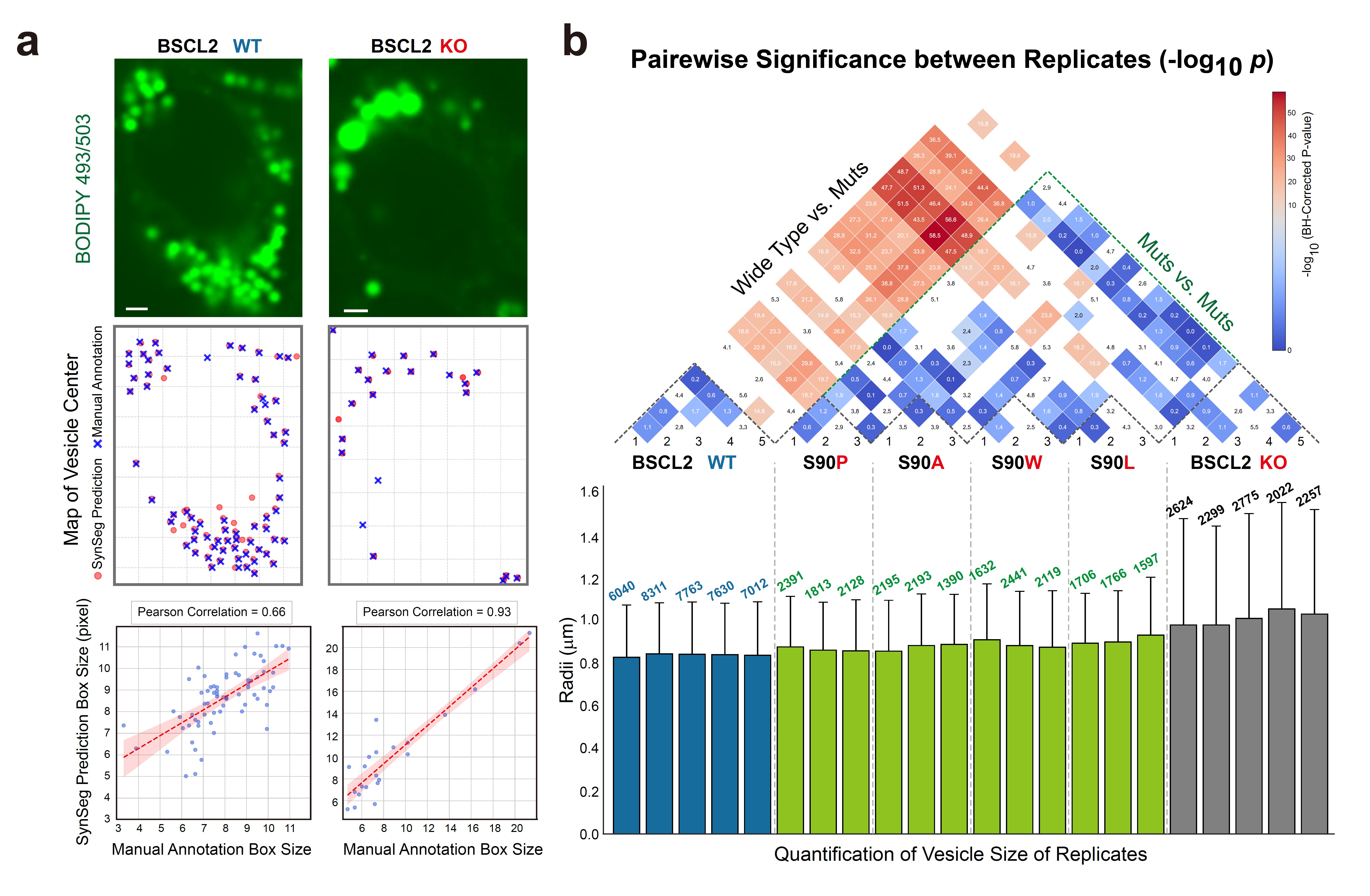 图2 扩展 SynSeg 框架用于疾病相关细胞定量分析。 (a) BSCL2 野生型(WT)细胞,与基因敲除(KO)细胞荧光图像,表明该模型能够准确测量两种细胞类型中的脂滴(LD)尺寸。(b) BSCL2 WT、KO 及四种错义突变体脂滴尺寸的定量比较与统计分析。热图呈现了所有生物学重复之间两两比较的结果, 颜色越深、表示被比较的两组之间的统计显著性越大。