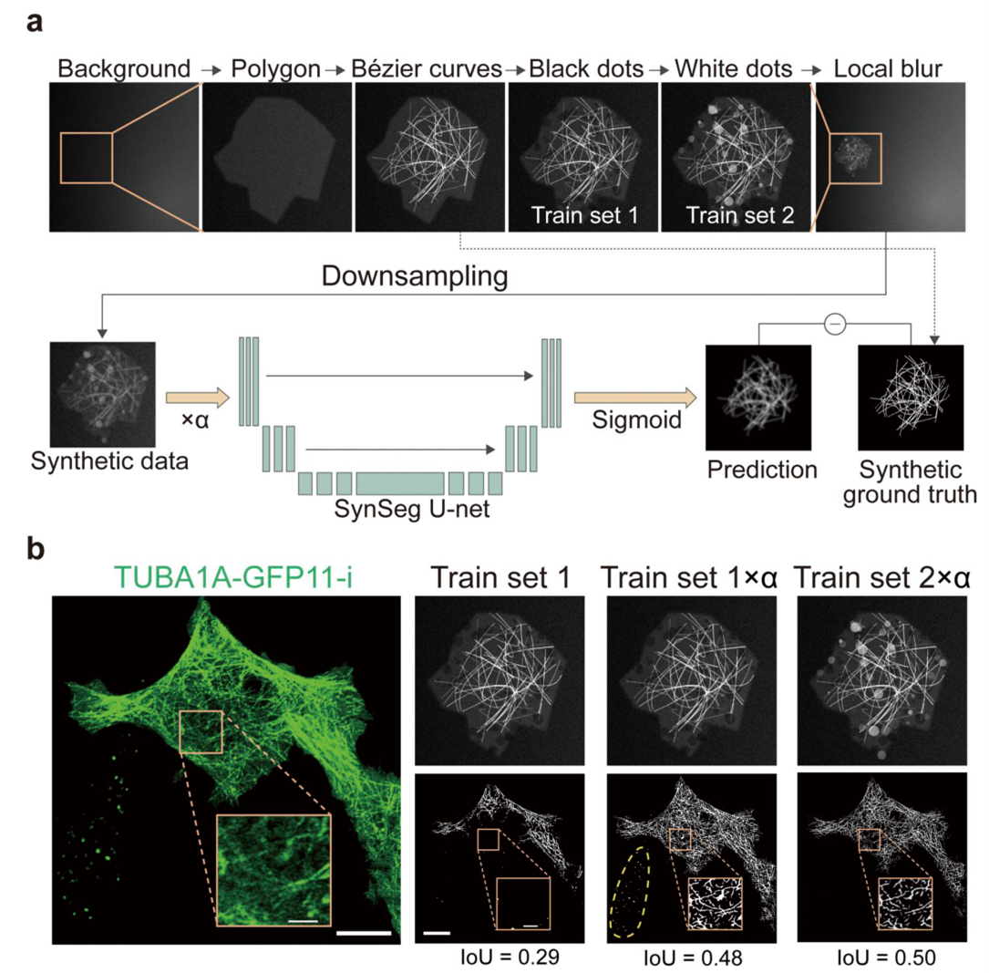 图1 细胞骨架为例分割模型。 (a) 合成细胞骨架数据集生成与U-Net模型架构。(b) 基于 Airyscan 成像对 split-GFP 标记的 TUBA1A 进行细胞骨架分割