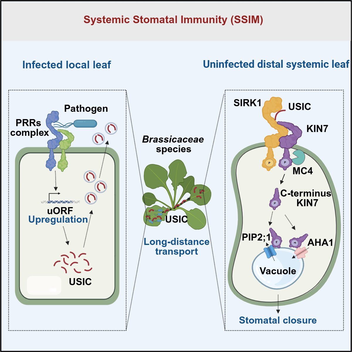 该团队进一步研究了系统性气孔免疫的分子基础,发现一个由上游开放阅读框 (uORF) 编码的小肽是介导系统性气孔免疫的关键移动性信号分子,命名为USIC。本地叶片受到侵染后,USIC迅速合成,包裹于囊泡中通过维管组织传递至远端未被侵染的系统叶片。在系统叶片中,USIC被保卫细胞表面的受体复合体SIRK1-KIN7识别,激活钙离子内流。这一信号触发半胱氨酸蛋白酶MC4对共受体KIN7进行剪切,释放KIN7胞内结构域,使其从质膜转移至液泡膜。KIN7胞内结构域与AHA1质子泵及PIP2;1水通道蛋白在液泡膜上相互作用,使液泡失水,驱动气孔快速关闭(图1)。令人振奋的是, USIC有效诱导白菜、甘蓝、萝卜、番茄等植物的气孔关闭,展现出良好的农业应用前景。