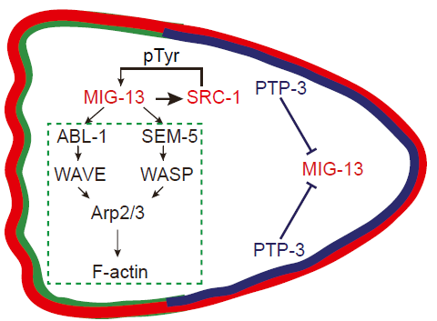 细胞迁移广泛参与个体发育和损伤修复等多种生理病理过程。细胞如何极化并实现定向迁移是细胞和发育生物学中的重要问题。欧光朔实验室早期发现了保守的跨膜蛋白MIG-13/LRP12在神经细胞内决定了迁移方向(PNAS, 2013),阐明了该受体的胞内激活途径促进微丝细胞骨架在迁移细胞前导端的组装 (Dev Cell, 2016)。然而,MIG-13受体均匀分布在细胞膜上,如何将其在前导端不对称的活化而在迁移细胞尾部失活,知之甚少。欧光朔实验室综合运用生化分析、遗传筛选和活体成像方法,发现MIG-13受体被酪氨酸激酶SRC-1激活,而被酪氨酸磷酸酶PTP-3失活,而内源的PTP-3蛋白特异的富集在迁移细胞的尾部,这样抑制了受体在迁移细胞尾部的活化。在抑制次生前导端的形成方面,欧光朔实验室于2020年7月3日在《细胞科学杂志》发表的文章阐明膜骨架(spectrin)提供的物理机制阻止分叉状微丝在细胞尾部的组装。