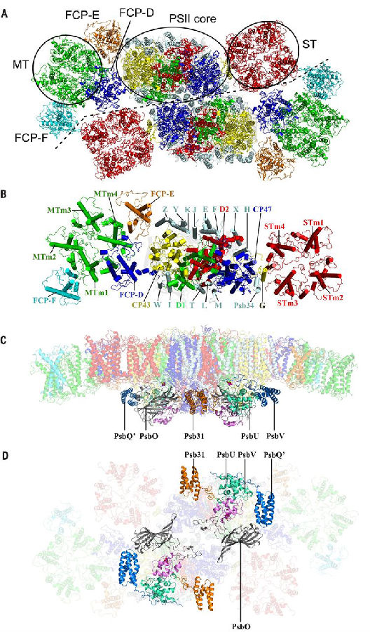 清华大学生命科学学院隋森芳院士研究组与中科院植物所沈建仁研究员和匡廷云院士研究组合作通过单颗粒冷冻电镜技术首次解析了海洋硅藻角毛藻(Chaetoceros gracilis)光系统II-捕光天线超级复合体的结构,分辨率达到3.02埃,为解释硅藻高效的能量传递和强大的光保护机制提供了关键的结构依据(图2)。该结构显示PSII-FCPII超级复合体为二聚体,每个单体包含PSII核心的24个亚基和FCPII的11个亚基,还有200多个色素分子以及大量的脂质分子,整个PSII-FCPII超级复合体含有70个蛋白亚基,分子量高达1.4 MDa。硅藻PSII-FCPII复合体近原子分辨率结构还揭示了大量的叶绿素a(Chls a), 叶绿素c(Chls c),岩藻黄素(Fx),硅甲藻黄素(Ddx)和胡萝卜素(BCR)独特的排列方式,为阐明PSII-FCPII超级复合体独特的吸收光谱,高效的能量传递,水裂解和强大的光保护机制提供了重要基础,为揭示PSII复合体的进化演变提供了重要线索,也为人工模拟光合作用提供了新理论依据,同时为后续指导设计新型作物、提高作物的捕光和光保护效率提供了新思路。该成果以研究长文发表在国际顶尖期刊《科学》(Science)上(The pigment-protein network of a diatom photosystem II-light harvesting antenna supercomplex)。