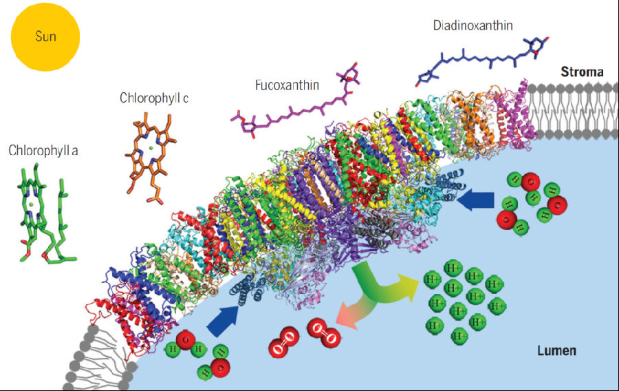 硅藻是海洋主要的浮游生物之一,贡献了地球上每年原初生产力的20%左右,这与其高效的光合作用能力以及强大的光保护能力密切相关,而这些都主要依赖于其独特的光系统以及外周捕光天线。光系统II(Photosystem II,PSII)是一个色素-蛋白超级复合体,它催化光诱导的水裂解反应,将太阳能转化为化学能,并释放出氧气。为了充分利用太阳能,光合生物进化出不同的捕光天线复合体(LHCs)用来捕获太阳能,并将能量传递给光系统II。硅藻的捕光天线系统主要结合叶绿素a/c和岩藻黄素(Fx),因此硅藻的捕光天线系统被命名为FCP,独特的捕光天线系统使硅藻在水下能高效的利用蓝绿光,同时还有极强的光保护能力。