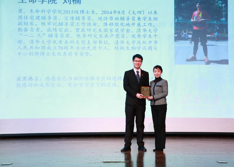 刘楠,清华大学生命学院2015级博士生,自2014年9月(大四)以来历任学院党建辅导员、宣传辅导员,现任带班辅导员兼学生组副组长。在学生工作过程中,他牢记辅导员工作使命,在潜移默化中开展工作,勤奋负责,成绩突出。曾获研究生国家奖学金、清华大学“一二·九”辅导员奖、优秀研究生共产党员、优秀学生干部、清华大学优秀本科生党支部书记、清华大学庆祝中华人民共和国成立70周年活动先进个人、结构生物学高精尖中心创新博士生优秀奖等荣誉。他很感恩自己当初担任辅导员的选择,表示在经历了无数感动和成长之后,他会更加坚守当下的道路。他说:“辅导员生活,是我在清华经历过的最幸福的时光。”