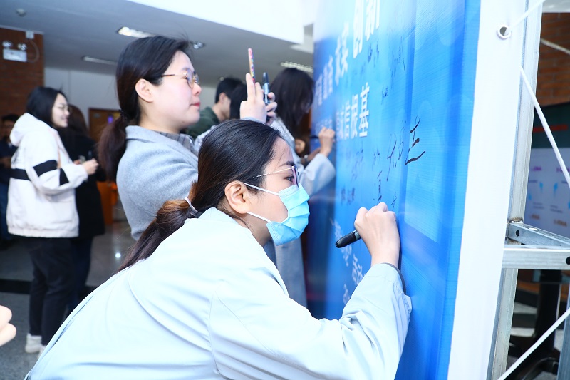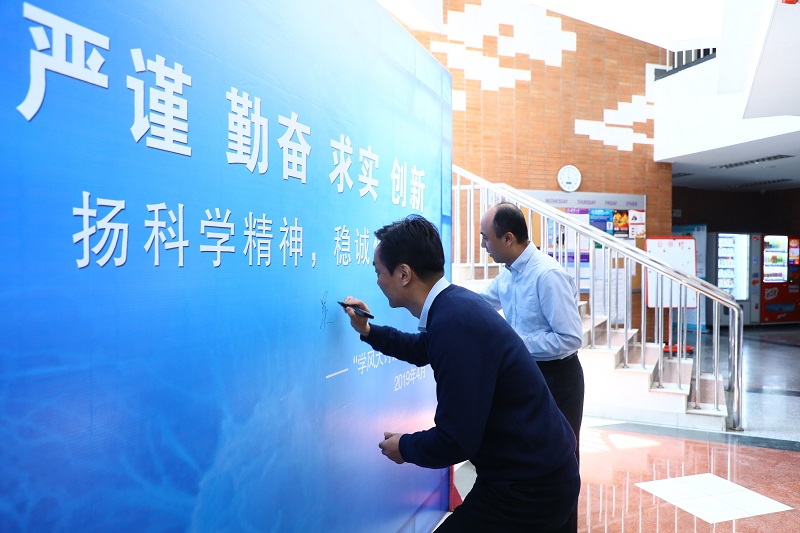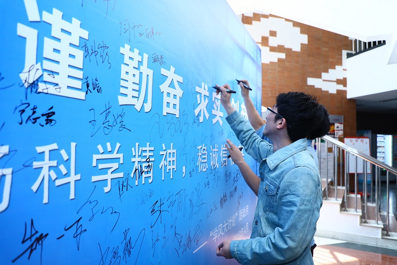活动尚未开始,大厅中就已经聚满了从四面八方赶来的同学们,大家摩拳擦掌,时刻准备着挥毫泼墨。生命学院的各位领导对于此次联合签名倡议活动极为重视,院党委书记吴畏和院长王宏伟准时到场,庄重严肃地在学术签名墙上签下了自己的名字,整场活动由此拉开序幕。