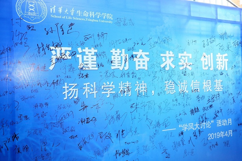 根据清华大学“学风建设年”的统一部署,生命科学学院于2019年3月29日全面启动了“学风大讨论”活动月。为了更好地动员全院研究生参与此次“学风大讨论”,生命学院于4月3日中午在生物新馆大厅举行了主题为“扬科学精神,稳诚信根基”的联合签名倡议活动!生命学院党委书记吴畏,院长王宏伟,党委副书记谢莉萍,研工组组长叶慧燕等老师出席了此次活动,经过党支部动员,共计500余名同学参加了此次活动,对于我院“学风大讨论”起到了极好的动员作用!