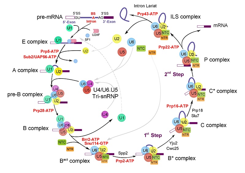 RNA剪接的本质是两步转酯反应,这种看似简单的化学反应在细胞中难以自行发生,而是需要一个巨大且高度动态变化的分子机器——剪接体(spliceosome)来完成。剪接体是一个由上百种蛋白质因子介导、核酸(RNA)催化的金属核酶,在剪接反应过程中,剪接体亚复合物及蛋白因子按照高度精确的顺序结合和解聚,依次形成预组装复合物 U4/U6.U5 tri-snRNP 及至少8个状态的完全组装剪接体 pre-B、B、Bact、B*、C、C*、P和ILS复合物,从而完成RNA剪接反应。