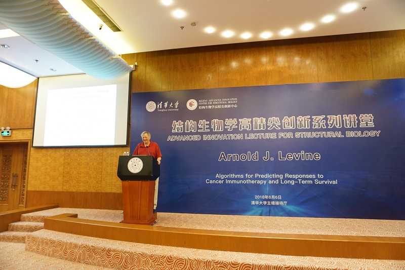 2018年6月6日上午,清华大学结构生物学高精尖创新中心邀请到美国科学院院士、普林斯顿高等研究院系统生物学中心荣誉教授——Arnold J. Levine,在清华大学主楼接待厅举办了一场题为《对癌症免疫疗法的响应及长期生存率的预测算法》(Algorithms for Predicting Responses to Cancer Immunotherapy and Long-Term)的学术报告,高精尖创新中心主任施一公教授主持了本次讲座。本次讲座吸引了众多师生前来聆听,庄严伟丽的报告厅内座无虚席,与会观众在学术的殿堂中享受了一次科学的洗礼。