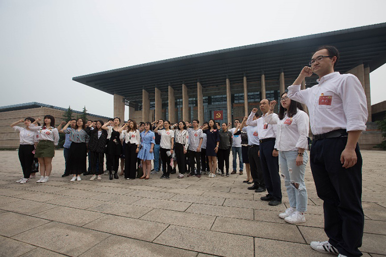 离开南湖革命纪念馆,来到馆后的入党宣誓墙前。大家面对庄严的党旗,郑重地举起右手重温入党誓词。