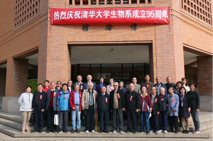 离退休教师和工作人员在生命科学馆门前合影