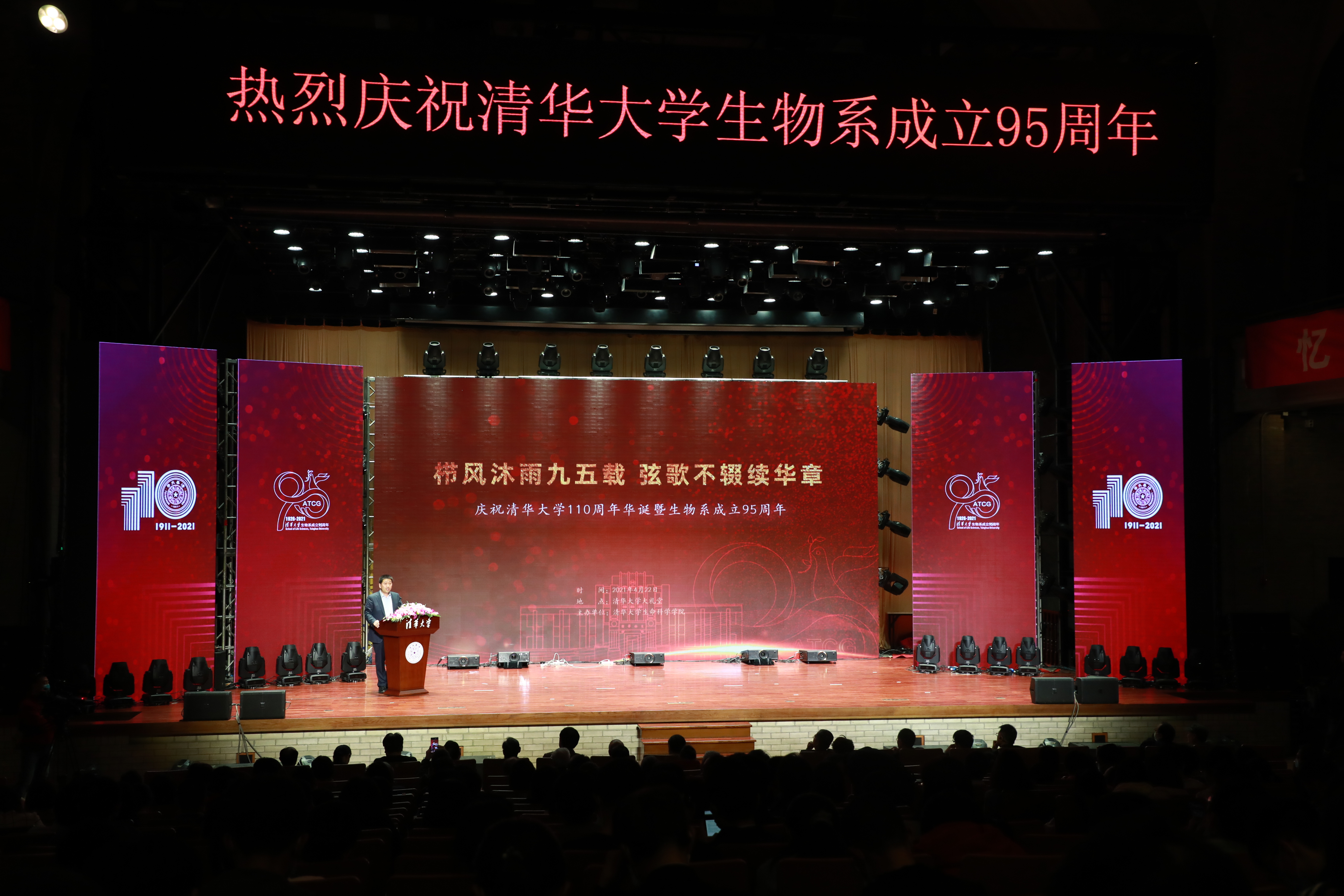 4月22日晚,清华大学生物系成立95周年庆祝大会在清华大礼堂隆重举行。出席会议的校内外嘉宾有:清华大学党委常务副书记姜胜耀,生物系恢复建系后的首任系主任、中科院上海神经科学研究所所长蒲慕明院士,清华大学医学院饶子和院士,生命学院王志新院士,孟安明院士,隋森芳院士,李蓬院士、陈晔光院士,谢道昕院士,清华大学生物医学交叉研究院、北京生命科学研究所学术副所长邵峰院士,医学院院长祁海教授,清华大学第一附属医院党委书记类延旭,苏州大学基础医学与生物科学学院院长吴嘉炜教授。此外,生物系(生命学院)的历任和现任领导,包括生物系原系主任赵南明教授,生物系原系主任、生命学院原党委书记陈应华教授,生命学院前任院长、现生命科学与医学研究院院长王宏伟教授,生命学院院长时松海教授及清华大学各部处代表、生物系离退休教职工、生命学院师生代表六百余人欢聚一堂,见证这一重要时刻。庆祝大会由生命学院党委书记吴畏主持。