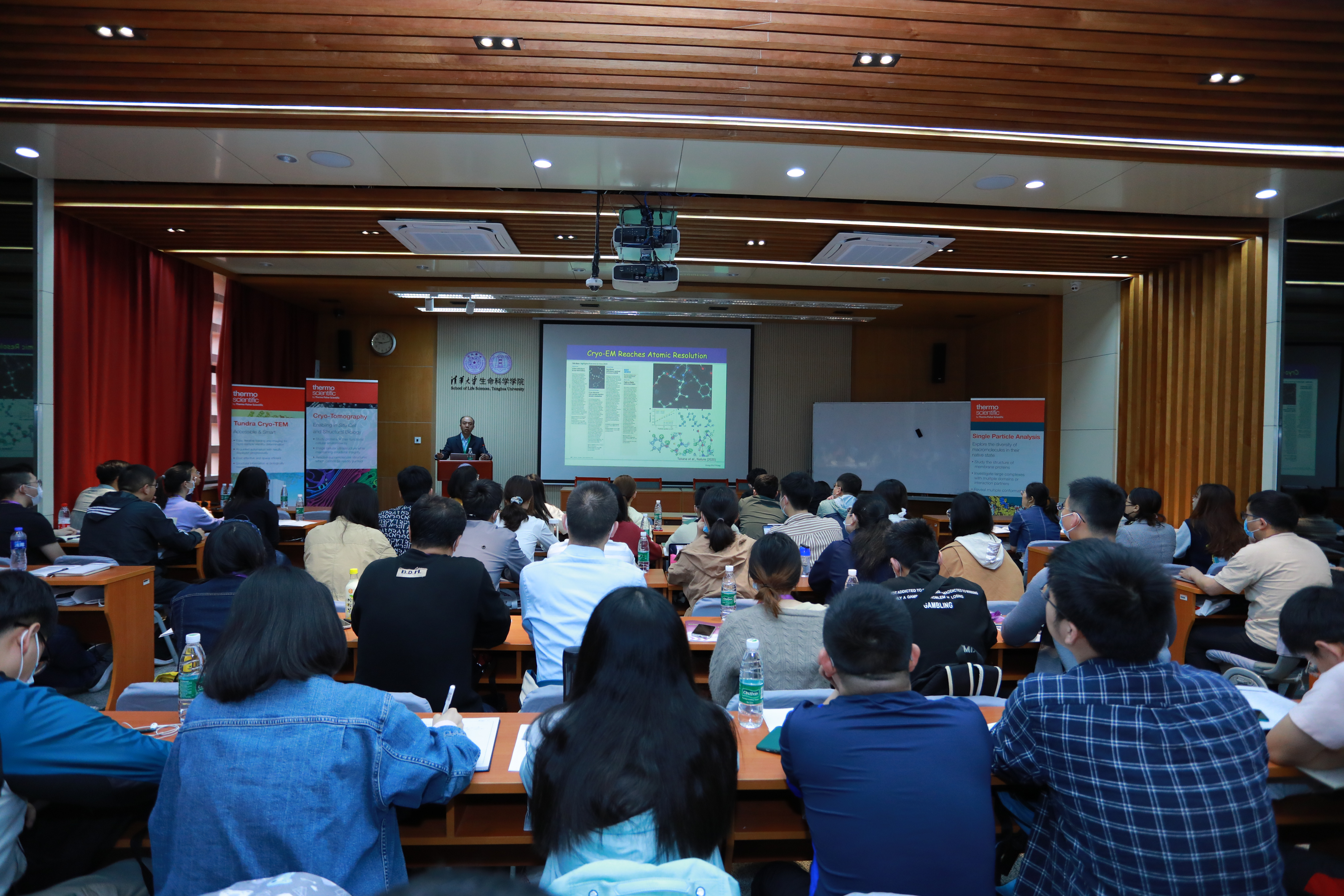 为期四天的研讨会分别在清华大学和中科院生物物理所进行,其中,讲座部分由13位嘉宾围绕各专题倾囊授业,几乎覆盖了所有冷冻电镜技术的相关内容,包括:“冷冻电镜的发展过程和最新进展”、“样品制备:负染与低温冷冻”、“电镜基础和成像原理”、“冷冻电镜的操作和图像采集方法”、“冷冻电镜图像处理和三维重构的基本原理”、“RELION图像处理软件简介”、“基于电镜密度图的建模和精修”、“CryoFIB技术”、“Tomography原位结构解析技术”和“MicroED技术“等。