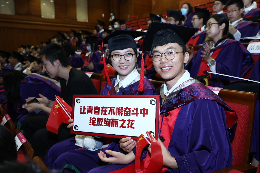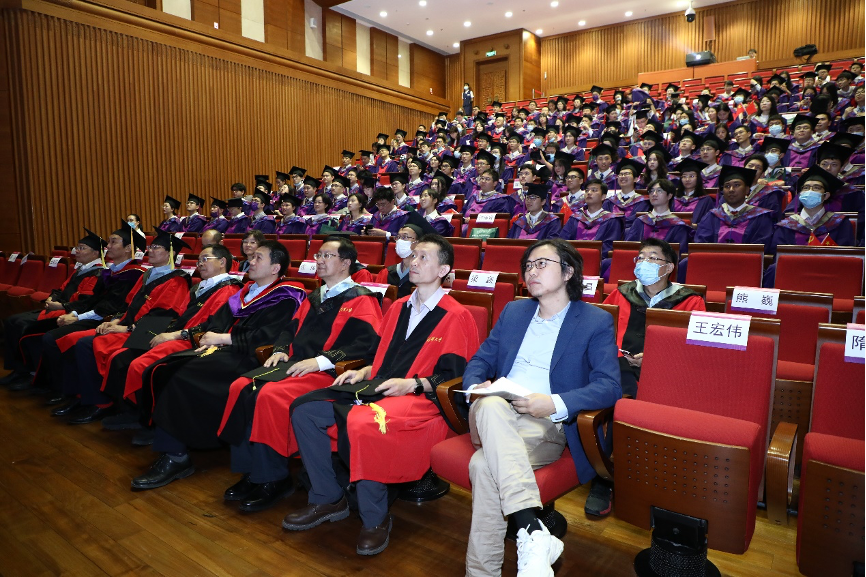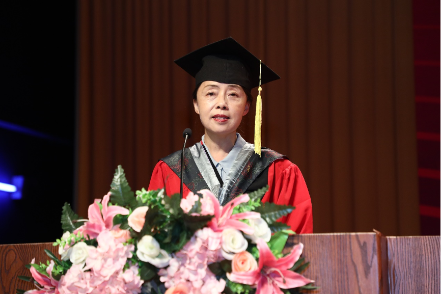 研究生代表王楠则向大家分享了读博以来的收获。她坦言,五年的学习时光不仅让她收获了理性批判分析的能力、强大的心里抗压能力,同时也时刻提醒她在科研探索中保持细心和耐心,这些宝贵的精神财富一直启迪她立志成为对祖国、对人民有担当、能奉献的新时代青年。最后她用荀子的话与大家共勉:“道阻且长,行则将至,行而不辍,未来可期”,也预祝所有毕业生同学能在各自的领域书写传奇。