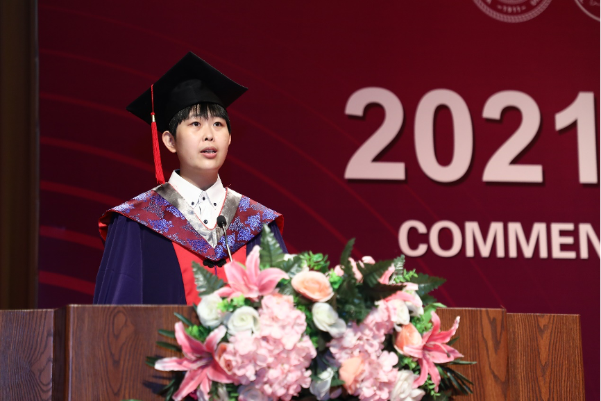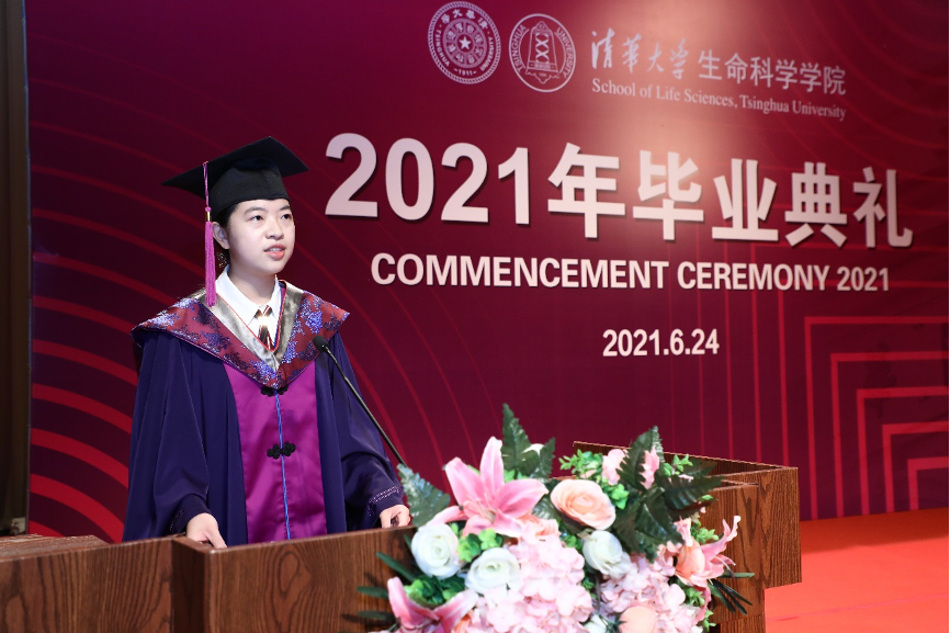 随后,毕业生代表上台向大家分享了自己在清华学习的感悟。本科生代表杨雨荻回顾了自己四年学习生活中的成长和蜕变,是母校的培养、恩师的点拨,才让她完成了从高中生到大学生的角色转变。她表示未来,将继续在清华精神的指引下,以先哲、大师为典范,把个人的奋斗融入祖国发展的洪流,为国家的建设贡献自己的力量。