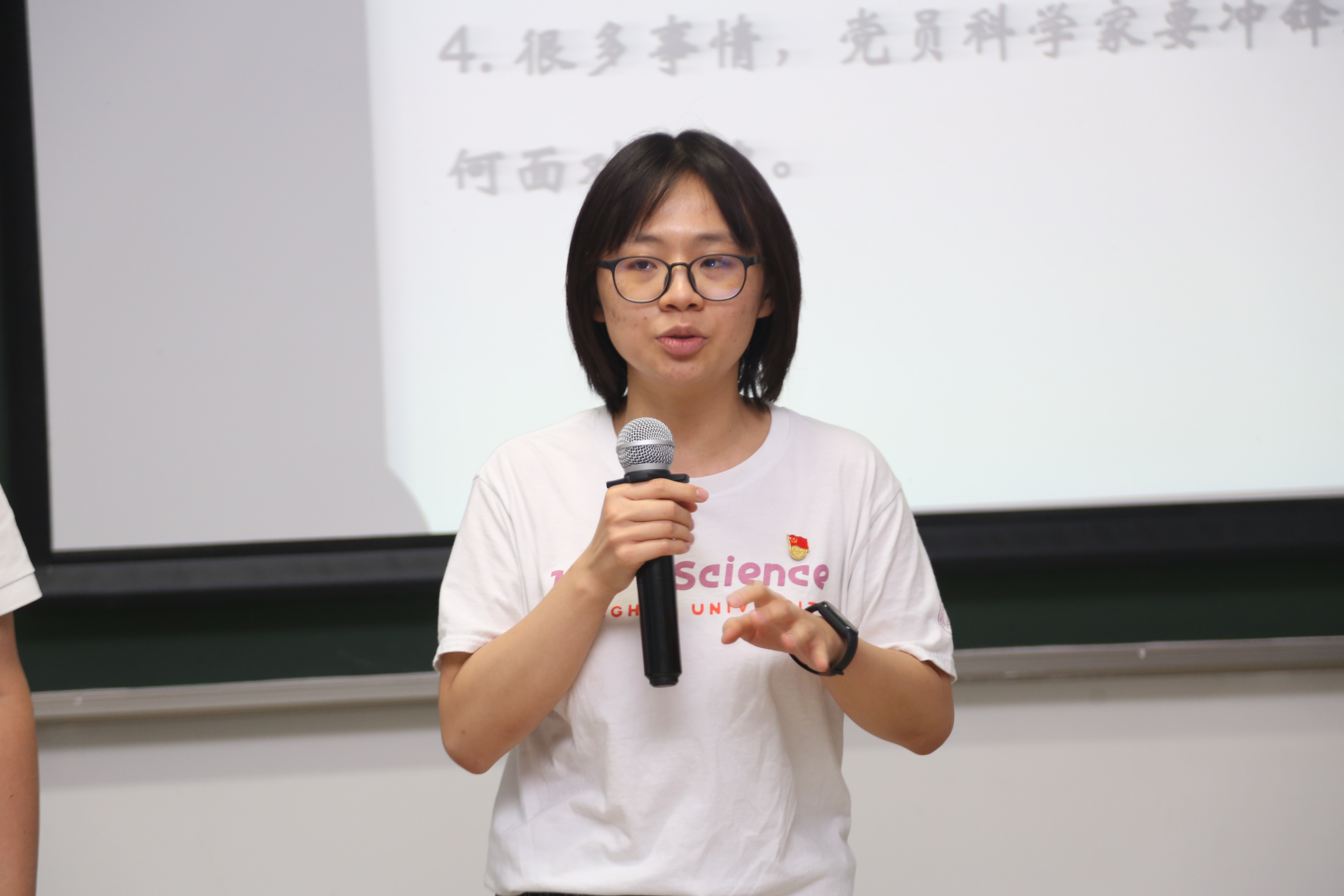 周帆老师作为新生代党员代表分享了自己赴美国参加会议的故事。周老师表示自己由此看到了我国与发达国家科技水平的差距,也看到了在国外很多人心中依然认为我国科技水平远远落后于他们。周帆老师以此勉励自己,也同时呼吁大家:生逢盛世,肩负使命,要拿好接力棒,致力于做踏实又冒险的科研工作。