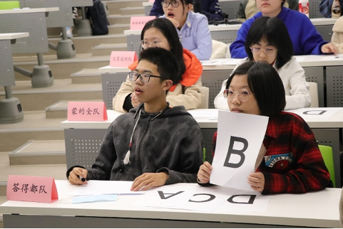 团体赛中场休息阶段,进行了个人赛的角逐,现场所有观众均可参与。个人赛分为“举手表决”,“流觞曲水”和“终极对弈”三个环节。举手表决阶段,参赛选手起立,通过举手对题目中的描述进行正误判断,回答错误的同学淘汰。六道题目过后,十位没有淘汰的同学顺利进入“曲水流觞”环节。本环节选手依次回答主持人提出的问题,回答错误者淘汰。经过一番激烈的角逐后,来自生15班的魏杨阳和来自生05班的刘洋芳同学进入了最终比拼:终局对弈。手拿题库的两位同学轮流向对方抛出问题,几个来回过后,刘洋芳累计回答错误三道题目,冲冠失败。最终,魏杨阳获得个人赛冠军,刘洋芳获得亚军。