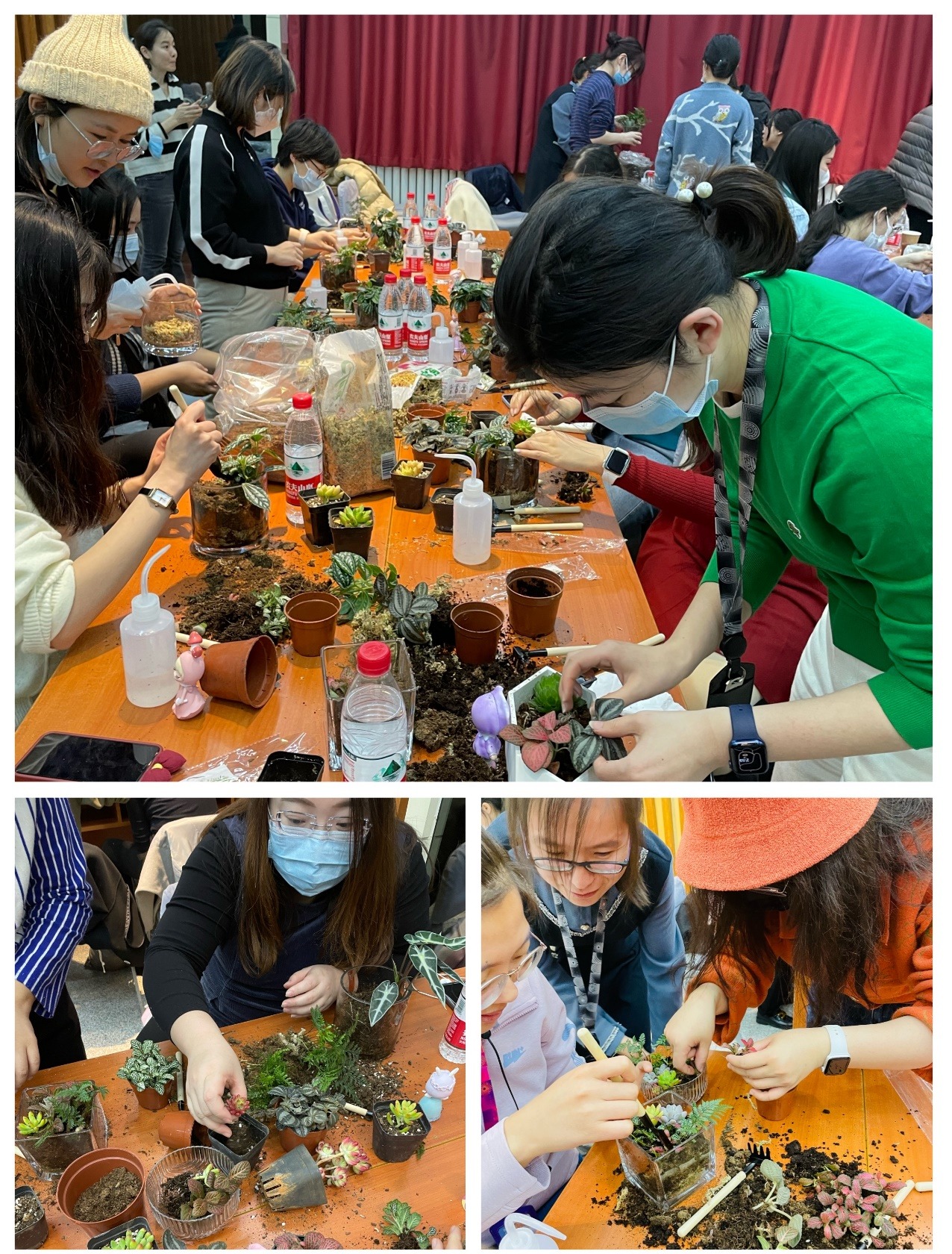 会场提供了多肉植物、绿叶植物、人物玩偶、盆栽三件套等各种材料。在专业老师的指导下,大家热情满满、跃跃欲试,尽情发挥自己的想象力和创造力,把各类植物和人偶按照自己的喜好搭配组合在一起。经过铺设水苔与泥炭土、选取植物、设计摆放、种植植物、培土和浇水等流程,完成了一盆盆错落有致的微景观构建。