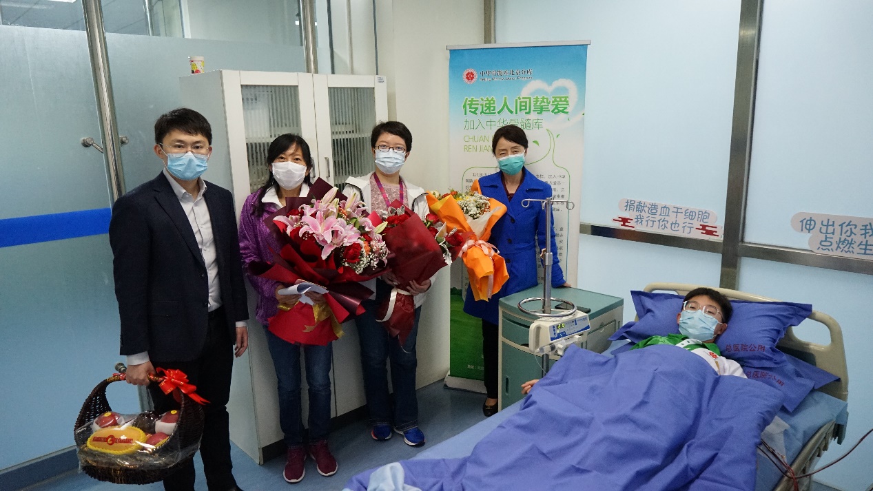 北京市红十字会捐献服务中心主任梁永清、生命学院党委副书记谢莉萍、校党委学生部副部长魏晶、校团委副书记于朔以及生命科学学院、清华园街道、校团委和海淀区红十字会的相关老师、同学到医院采集室看望并慰问了郭超杰,为他送上鲜花、水果等慰问品。
