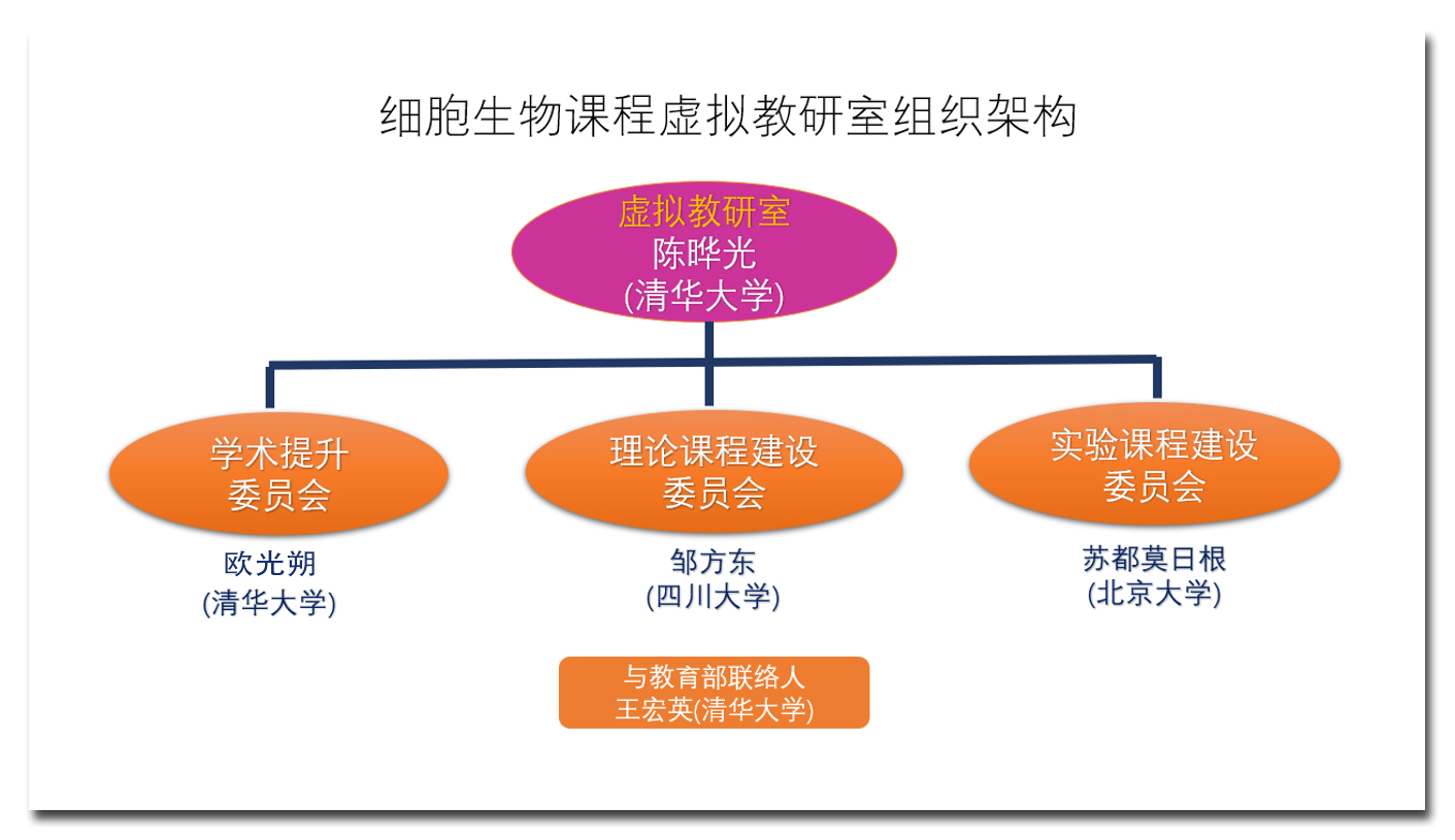 细胞生物学课程虚拟课程教研室由教育部高校生物科学类专业教指委副主任、清华大学陈晔光院士负责,初创成员来自全国23所高校,包括6门国家级一流细胞生物学本科课程负责人,多位国家级教学成果奖获得者、首届全国教材建设奖获奖教材《细胞生物学》和《分子细胞生物学》主编以及多位国家高层次人才支持计划支持的专家学者。清华大学生命学院欧光朔负责虚拟教研室的学术提升委员会,现代生命科学实验教学中心王宏英作为教研室的教育部联络人。教研室建设的合作单位包括高等教育出版社和中国细胞生物学学会。