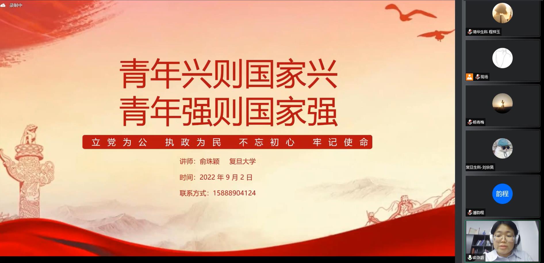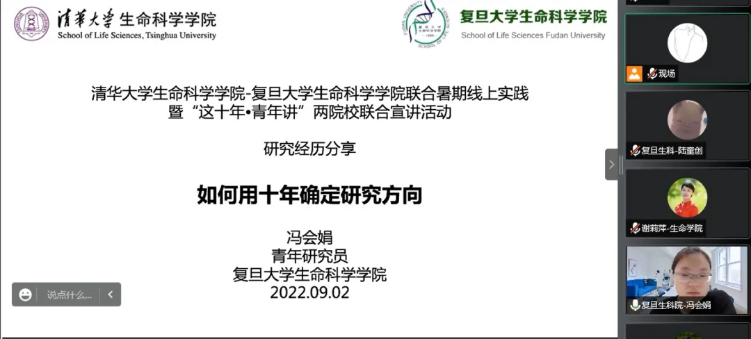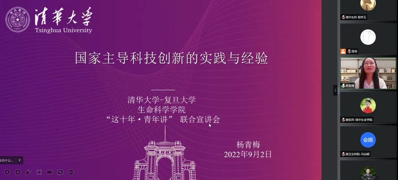 党的十八大以来的十年,是党和国家事业发展极不平凡的十年。在以习近平同志为核心的党中央领导下,我国全面建成小康社会,开启了全面建设社会主义现代化国家新征程,各领域建设都取得了历史性成就。为帮助青年学生深入领会科学家精神,感悟“把论文写在祖国大地”的深刻内涵,9月2日晚,清华大学生命科学学院联合复旦大学生命科学学院,共同举办“这十年·青年讲”宣讲活动,来自两校的90名师生通过线上、线下的方式参加了活动。宣讲会由清华大学生命科学学院研团总支书记宋佶岭同学主持。