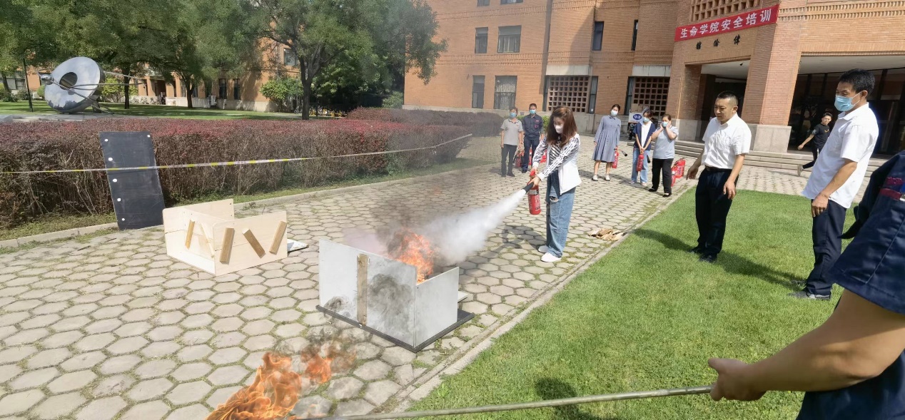9月8日下午,在生命科学馆门前组织了灭火器操作培训,帮助师生掌握使用灭火器技能。学院师生共计20余人参加培训。