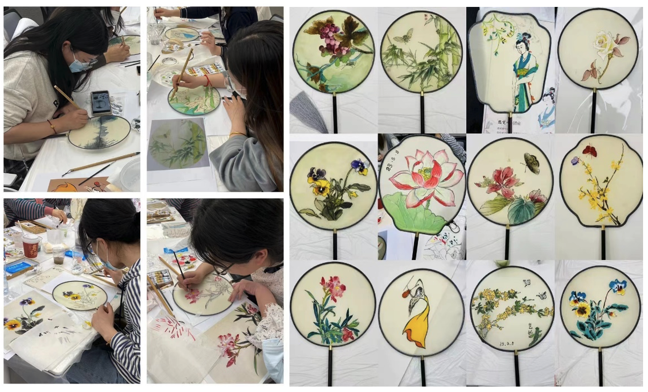 分工会为大家准备了丰富的DIY材料包(包括空白扇子、水彩颜料和画笔等),以及精美的扇面样本。张云老师首先通过两段教学视频,为大家介绍了水彩绘画技巧,随后大家按照喜好挑选了临摹样本,纷纷开始提笔作画并互相交流,过程中欢声笑语不断。短短2个小时,老师们就创作出一把把风格独特的团扇,中华传统的精致典雅之美在大家手中一一彰显。