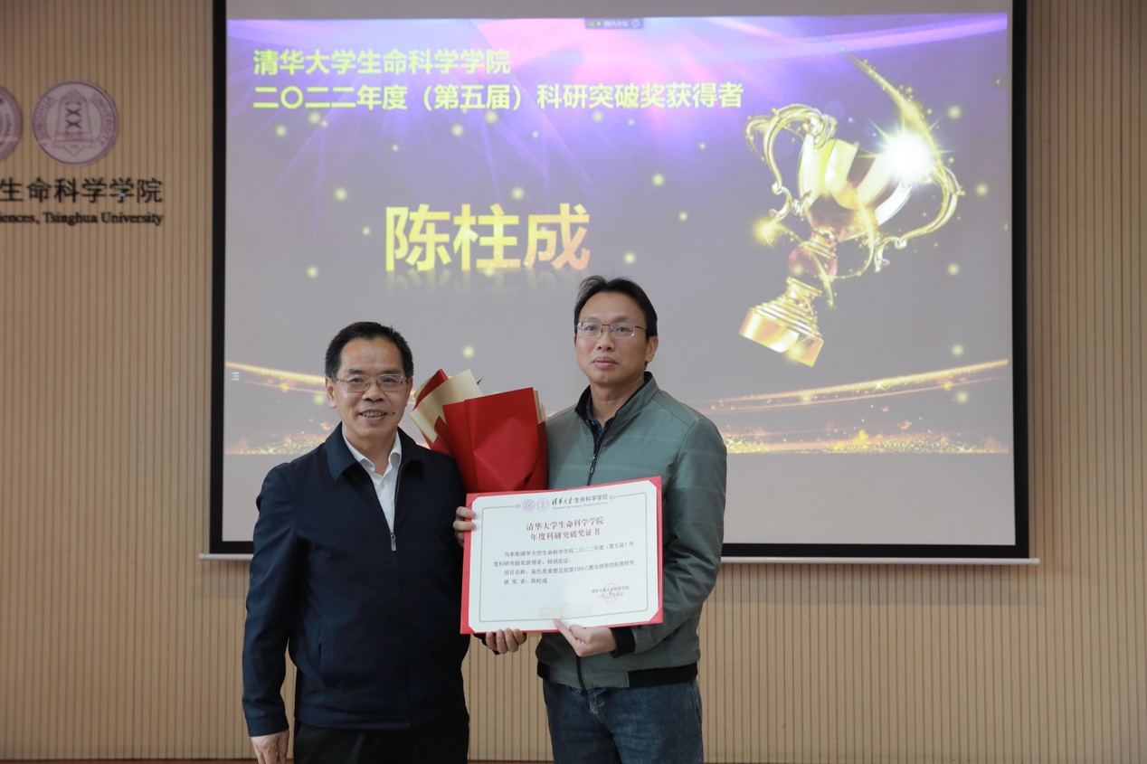 会上还颁发了2022年度(第五届)年度“科研突破奖”,学院主管科研工作的副院长颉伟介绍该奖项章程并宣读颁奖决定:经过学院学术委员会评审,学院党政联席会讨论决定,将科研突破奖授予科研成果——“染色质重塑及组蛋白H4乙酰化修饰的机理研究”,完成人陈柱成。