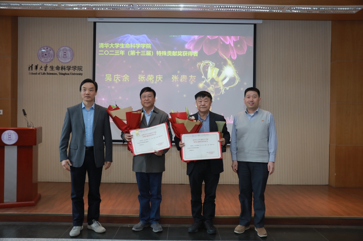 首先颁发“生命学院特殊贡献奖”。本次获奖的三位老师分别是吴庆余、张荣庆和张贵友。时松海介绍奖项设立背景,宣读颁奖词,并代表学院真诚感谢三位老师在本科生教学体系改革、实验教学中心和标本馆建设等工作中做出的卓越贡献。