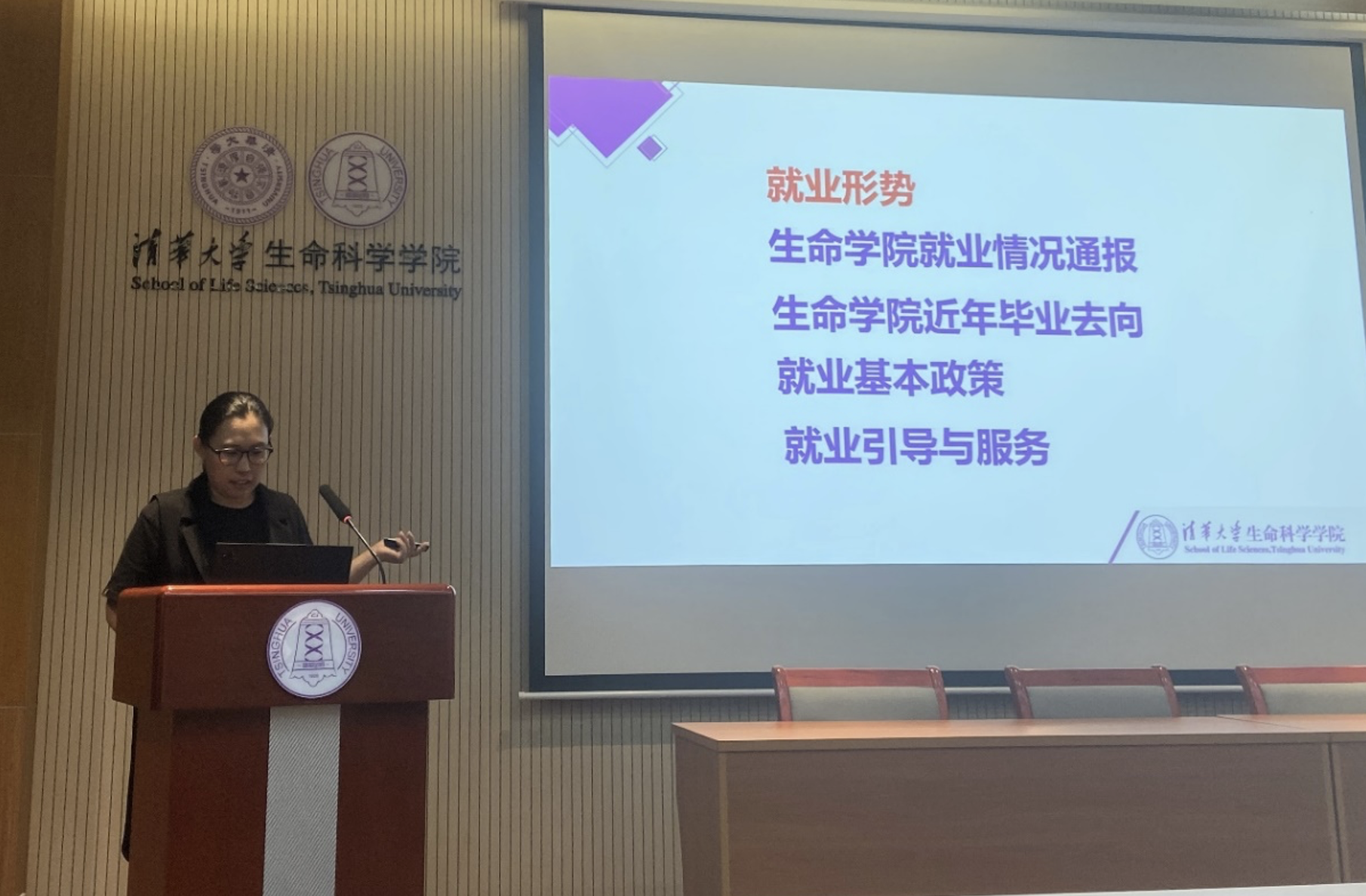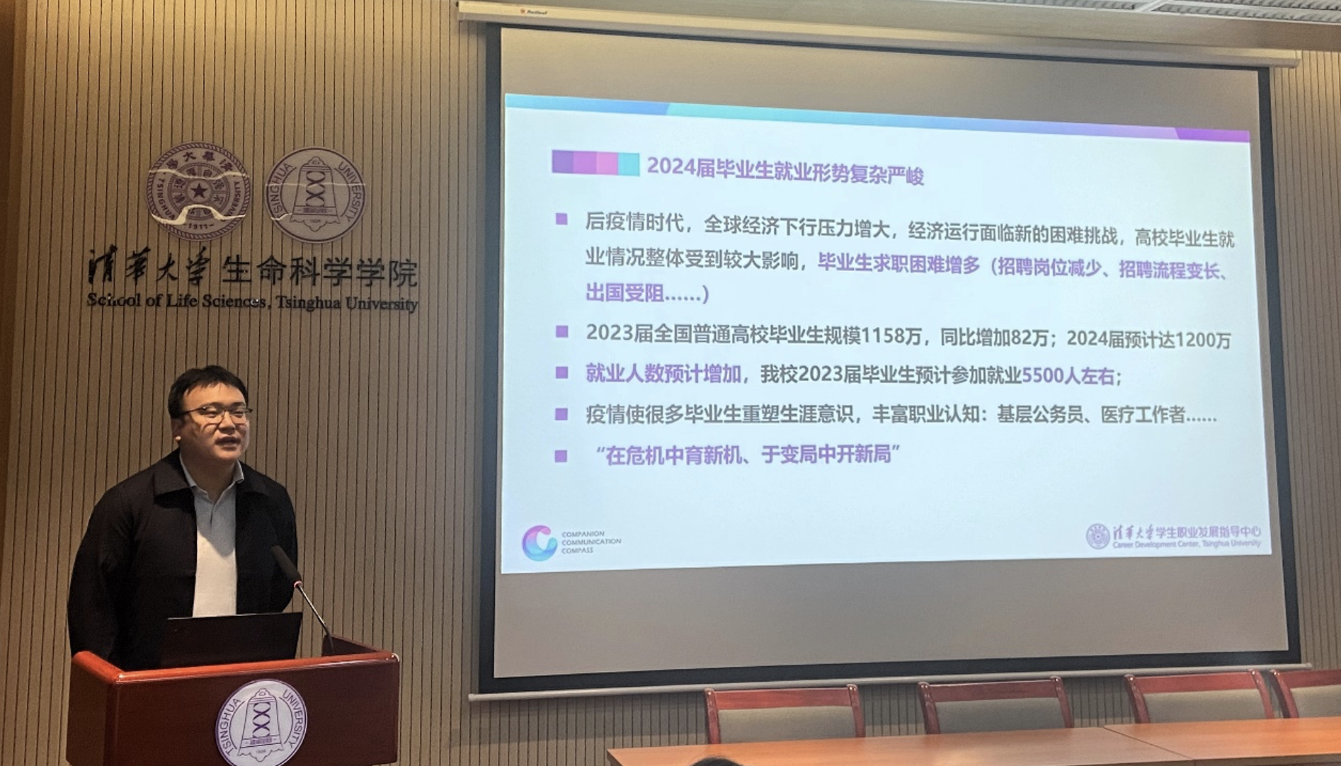 董园介绍了近年来生命学院毕业生就业领域、单位性质和地域选择等情况。在就业选择方面,她鼓励大家重点关注高等院校、科研单位、国有企业、医疗机构、省部级以上科研单位、公共服务部门和生物医药企业等领域。此外,她还详细介绍了生命学院2023年秋季学期的就业安排、毕业生就业手续办理流程以及就业信息获取渠道等内容,希望同学们利用好校内外各种资源,积极参加学校、学院组织的各类型招聘活动,要做好充分的就业准备。