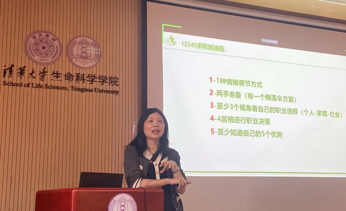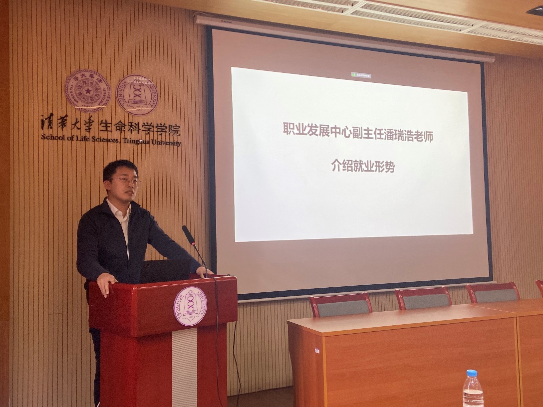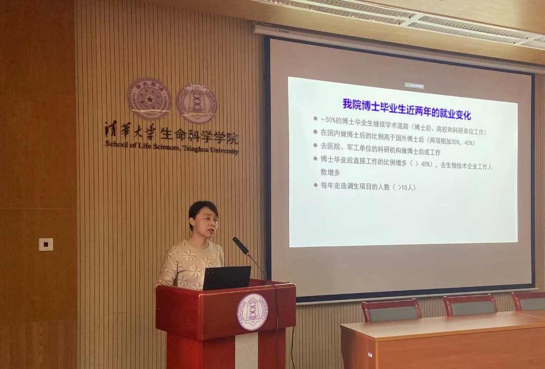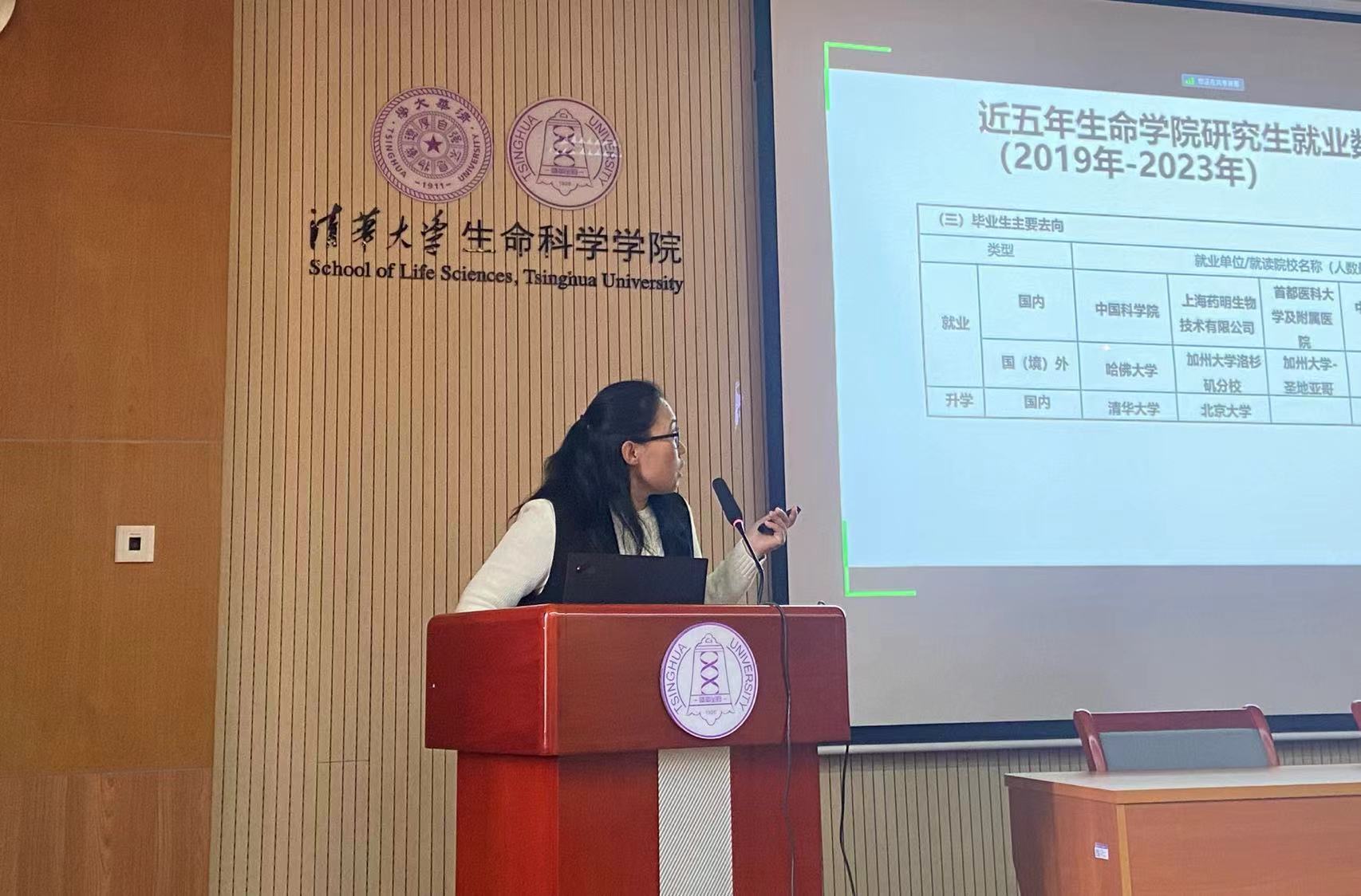 董园介绍了去年生命学院毕业生的就业领域、单位性质和地域选择等情况。目前,生命学院博士毕业生的就业单位主要集中在高等院校、科研单位和生物医药企业等。由于毕业批次调整,她希望同学们要积极关注就业动态,及早开始找工作,多多关注就业信息获取渠道,积极参加学校、学院组织的各类型招聘活动。
