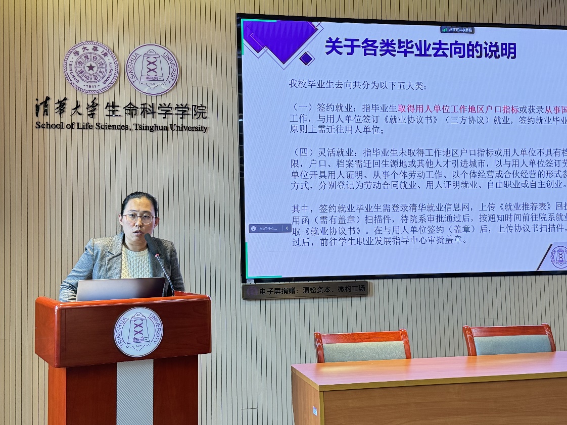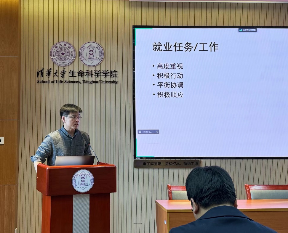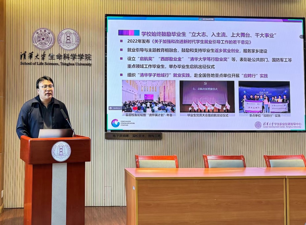 首先,魏强强结合我校毕业生就业情况向与会同学作求职经验分享。后疫情时代,受全球经济下行影响,2025届毕业生就业形势依然复杂严峻,魏强强鼓励清华同学要勇于“立大志、入主流、上大舞台、干大事业”。他结合全校本硕博最新就业数据,以坚持引领未来中国发展方向的清华校友职业发展经历为例,结合高校教职概念和选调生概念,深入解读了高校毕业生就业相关政策,并向大家介绍了国企、军工研究所等传统路径的新政策和新方向,也从求职方式、求职渠道和求职材料准备等方面对同学们进行了全面的指导。