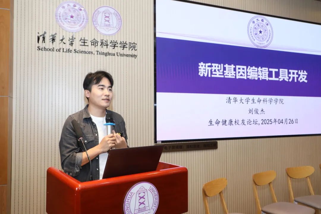 论坛下午时段,“AI 驱动医疗创新” 板块由孙磊校友主持。清华大学基础科学讲席教授、心理与认知科学系主任、北京智源人工智能研究院首席科学家刘嘉作 “NeuroAI/神经智能:融合脑科学与 AI 赋能脑健康、脑机接口与数字永生” 的主题分享。他介绍了近年来人工智能领域日新月异的变化,阐述了目前通过AI技术进行脑科学研究的方式,并分享了通过脑机接口不断拓展生物禁锢的认知边界的应用实例。清华大学生命学院副教授、生命学院 2011 级博士校友刘俊杰作 “新型基因编辑工具的开发” 的主题报告,阐述了基因编辑技术在治疗人类疾病方面广阔的应用前景,并详细介绍了本实验室在新型基因编辑工具开发方面的最新成果。