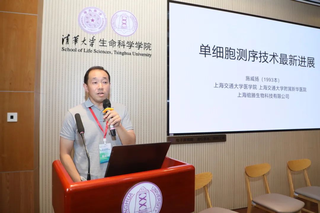 “精准医疗时代下的科学仪器创新” 板块由许军普校友主持。上海交通大学医学院教授、新华医院研究员、万乘基因创始人、生命学院1993级本科校友施威扬作了题为 “单细胞测序检测的最新进展”的主题报告,介绍了AI时代下单细胞研究的重大突破及超高通量单细胞技术,展示了鼠脑的in house超高通量转录组demo数据。清华大学生物样品制备与鉴定平台主管、清华膜国重青山湖分室 PI 、生命学院2011级博士校友、医学院2014级博后校友李文奇作了题为 “生物样品制备与鉴定仪器研发之探索”的报告。他介绍了自主研发的全自动通量蛋白纯化系统,将实验人员从劳动密集的蛋白纯化实验中解放出来。他改良了分析超速离心技术(AUC),并介绍了这项技术在药物领域的应用与优势。