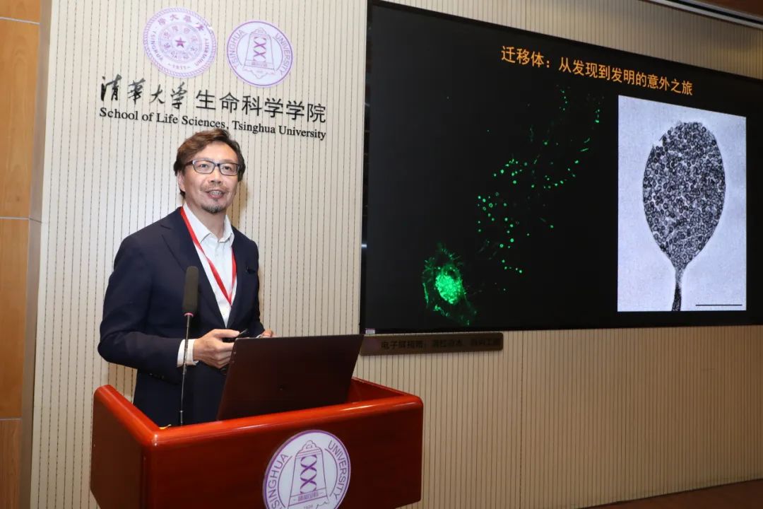 主旨报告环节,清华大学生命学院教授俞立带来题为 “迁移体:从发现到发明的意外之旅” 的报告,深入浅出地阐述了迁移体研究的重要发现与创新应用。随后,药明合联首席执行官兼董事、化学工程系 1991 级本科校友李锦才分享了 “药明合联新征程”主题报告,介绍了药明合联公司在生物医药领域的战略布局与创新发展成果。