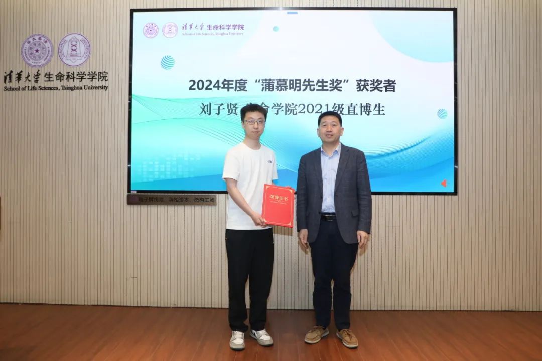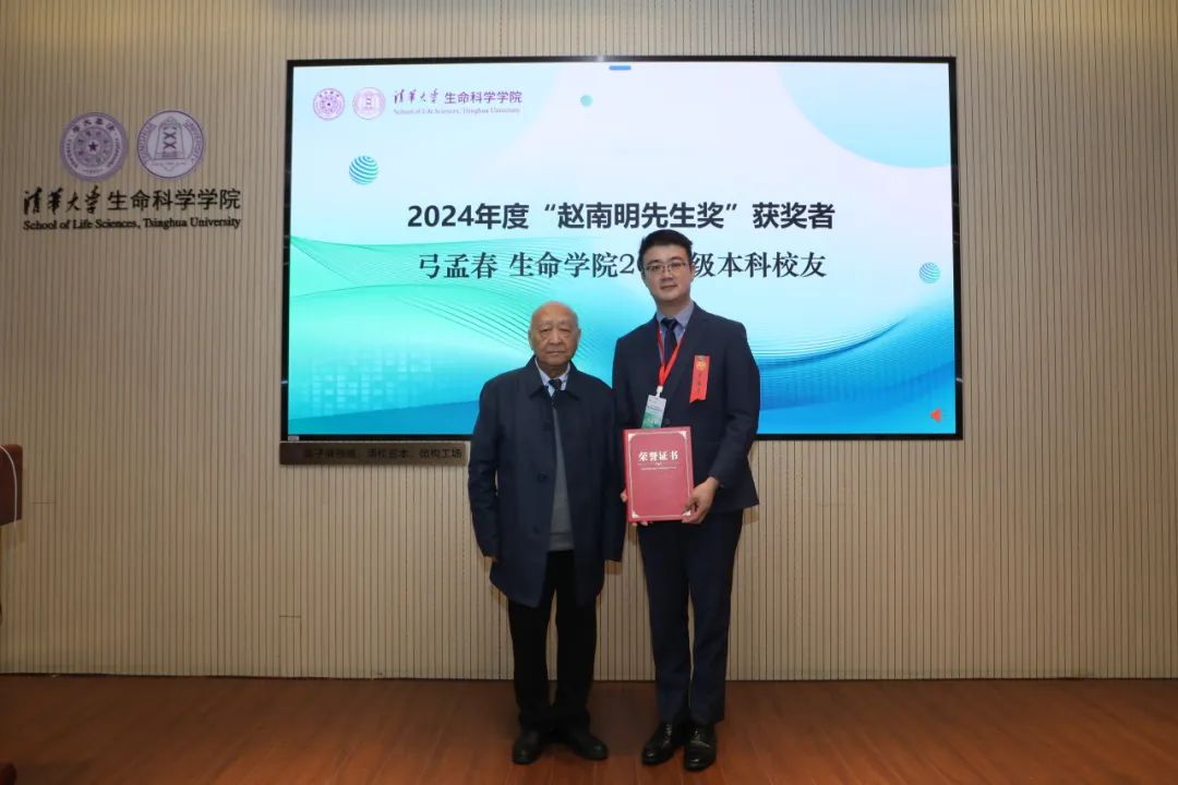 此次论坛颁发了“蒲慕明先生奖”、 “赵南明先生奖”。清华大学生物系复系首任常务副系主任赵南明、清华大学生命科学学院院长时松海分别为2024年度“赵南明先生奖”获奖者弓孟春(生命学院2003级本科校友)和2024年度“蒲慕明先生奖”获得者刘子贤(生命学院2021级直博生)颁发了荣誉证书。赵南明老师介绍了“蒲慕明先生奖”和“赵南明先生奖”的初心是为了培育更多生物学科人才,寄托了对清华生物系学子们青出于蓝而胜于蓝的殷切希冀。两位获奖者分别发表了真挚的获奖感言。