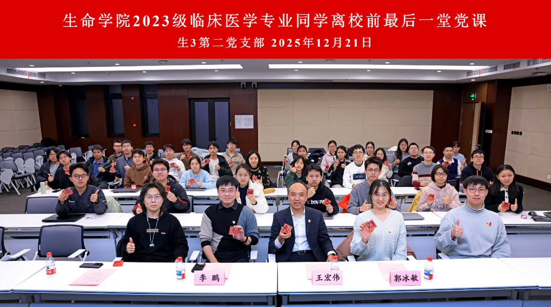 12月21日晚,生命学院生3第二党支部在生物医学馆E109报告厅举办生命学院2023级临床医学专业学生离校前最后一堂党课。本次活动邀请校党委常委、副校长王宏伟作为主讲嘉宾为同学们讲党课,生3第二党支部党员与入党积极分子共计40余人参加,生命学院党委副书记李鹏、学生工作组组长郭冰敏出席活动。