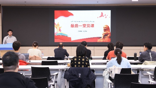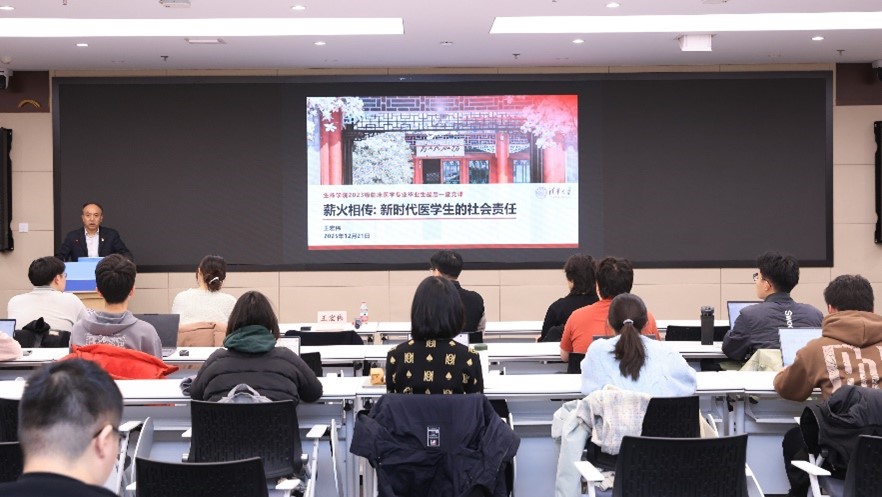 随后,王宏伟老师以 “ 薪火相传: 新时代医学生的社会责任 ” 为题为同学们讲授了 专题 党课。 他 从清华与协和两校的精神讲起,介绍了两校深厚的历史渊源与密切的合作关系,以及临床医学专业“八年一贯制,本硕博融通,加强基础,注重技能,强调素质,整体优化,面向临床、科研”的育人特色。王宏伟老师同时向同学们介绍了清华生命学院的院史与医学学科发展,希望同学们在未来的临床医学学习中不忘清华精神与生院精神。 接着,他 向同学们介绍了清华大学举办毕业生党员最后一堂党课的优良传统,与学校积极鼓励毕业生党员“赴西部、基层、部队、高校和重点单位工作”的就业导向, 并 结合丰富的实例启发同学们:新时代的医学生应当以人民健康为中心, 在国家需要时挺身而出, 同时兼顾科技创新与伦理自觉。最后,王宏伟老师鼓励同学们在未来做出人生选择时 , 将个人价值融入国家与社会需要,积极响应“健康中国2030”规划纲要与“十五五”规划,做挺膺担当、勇立潮头的新时代青年。