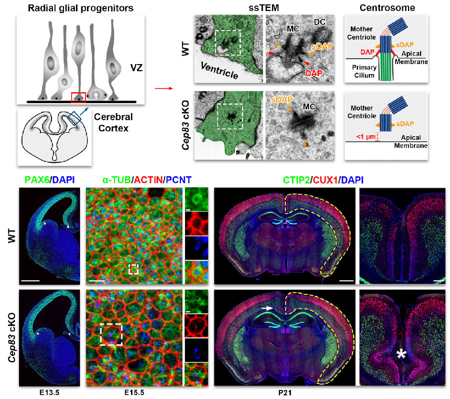 This study resolves the long-lasting mystery of the function and mechanism of the unique centrosomal subcellular organization in RGPs. It adds an entirely new dimension to the regulation of RGP behavior and cortical development. In addition, while mutations of the centrosomal proteins have been strongly associated with microcephaly (i.e., small brain), this study, for the first time, demonstrates that mutation in the centrosomal protein can also lead to megalencephaly (i.e., large brain). More importantly, human patients with biallelic CEP83 mutations exhibit enlarged brain ventricles and intellectual disability, in addition to infantile nephronophthisis. Therefore, this study also provides important new insights into human cortical malformation and intellectual disability.