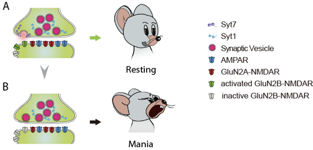 Previously, Yao and Gage et al. have reported that Syt7 is key for the bipolar-like behavioral abnormalities in mice. In the present study, the authors first performed sequencing analysis in >1400 BD patients and >1200 healthy control subjects, and found several Syt7 SNPs in the patients but no Syt7 mutation was found in any healthy control subject, thus confirming the association of Syt7 with the susceptibility to BD in humans. Then, the authors treated Syt7 KO mice with Ro25-6981, a GluN2B-NMDAR antagonist similar to ketamine, and found that Ro25-6981 had robust effects on the wild-type mice but only showed moderate effects on the Syt7 KO mice. This result indicated that the authors’ hypothesis is probably correct. Then, the authors combined super-resolution STORM and SIM imaging techniques and the electrophysiological approach, and found that Syt7 and GluN2B-NMDARs were localized to the peripheral synaptic region, and Syt7 triggered glutamate release to efficiently activate the juxtaposed GluN2B-NMDARs. Thus, Syt7 deficiency and SNPs induced GluN2B-NMDAR dysfunctions in mice, and patient iPSC-derived neurons showed Syt7 deficit-induced GluN2B-NMDAR hypoactivity. The authors therefore concluded that Syt7 defects induced mania through attenuating GluN2B-NMDAR activity, which enabled the NMDAR antagonists to avoid mood overcorrection.