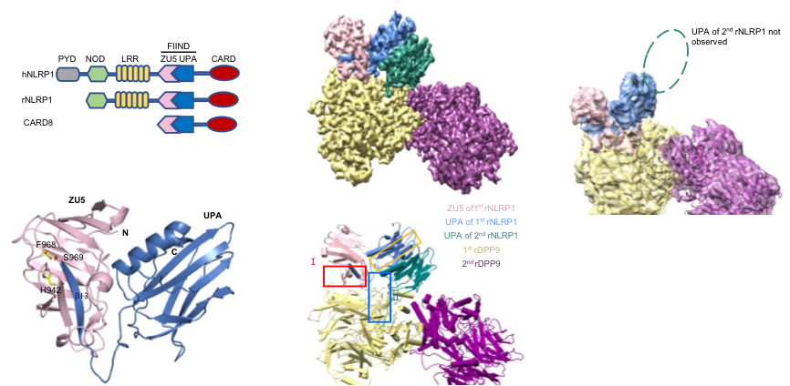 Jijie Chai's group firstly resolved a crystal structure of the rat NLRP1 FIIND domain (Figure 1b), unveiling the mechanism of NLRP1 autoinhibition mediated by the ZU5 subdomain of FIIND (Figure 1a). The group then obtained a high resolution Cryo-EM structure of the full-length rat NLRP1-DPP9 complex (Figure 1c-d). Unexpectedly, the structure revealed that rNLRP1 and rDPP9 form a 2:1 complex containing an auto-inhibited rNLRP1 molecule and an active rNLRP1 UPA-CARD fragment. Through collaboration with Franklin Zhong's group and Bin Wu's group at Nanyang Technological University, they showed that the complex functions to inhibit activation of the NLRP1 inflammasome by sequestering the active fragment and fortifying NLRP1 autoinhibition. Furthermore, they provided evidence that both NLRP1-binding and enzymatic activity are required for DPP9 to suppress NLRP1 activation in human cells. The study also implies the existence of an unidentified DPP9 substrate required for NLRP1 inhibition, and suggests that the 2:1 NLRP1-DPP9 complex may act as a bona fide receptor sensing diversified signals to mediate innate immjune responses (Figure 2).