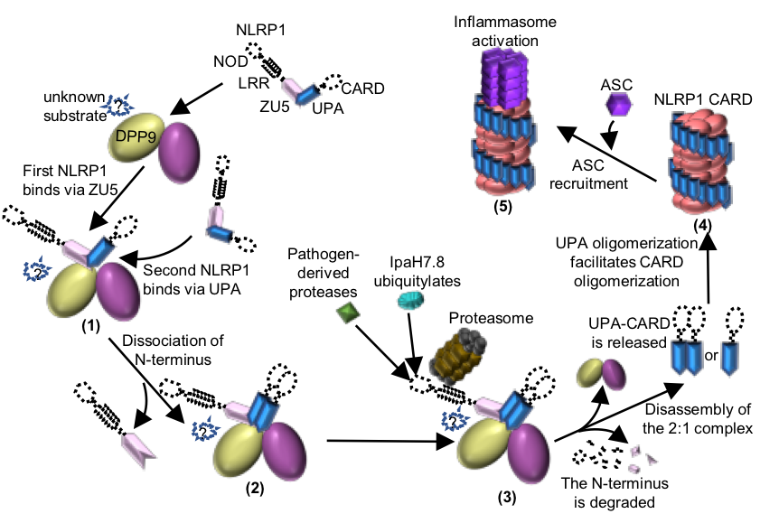 Figure 2 Working model of the DPP9-mediated inhibition of NLRP1 and the pathogen-induced activation of NLRP1.
