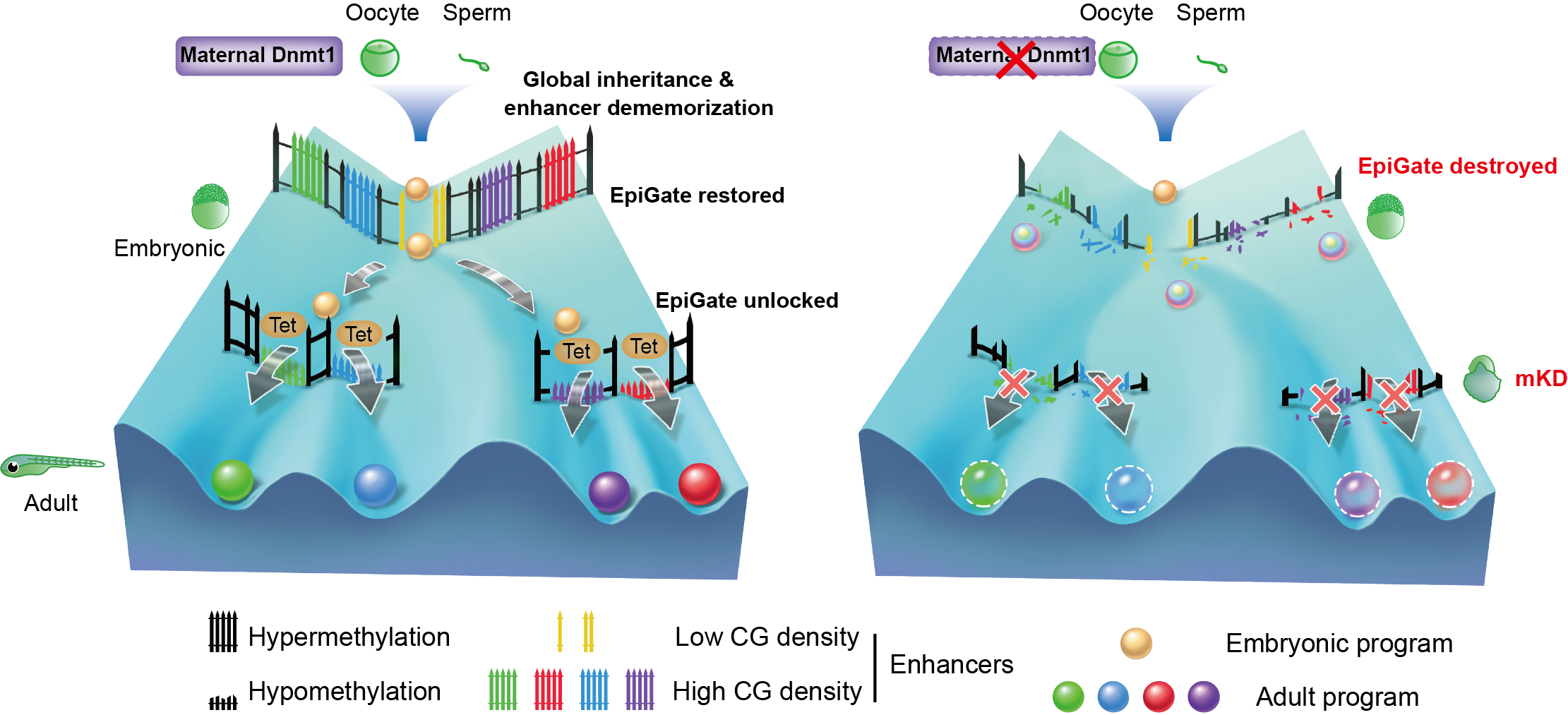 Using a combination of powerful genetic tools and ultra-sensitive chromatin analysis methods, the researchers investigated the function of DNA methylation in early zebrafish development. By knocking down maternal dnmt1 using OMIS (Oocyte Microinjection in situ), a method previously developed to deplete maternal factors, the researchers successfully eliminated DNA methylation before zygotic genome activation (ZGA) in zebrafish, which led to embryonic lethality around gastrulation. Furthermore, these mutant embryos exhibit ectopic activation of adult enhancers and somatic genes after the loss of DNA methylation, suggesting that enhancer dememorization and global DNA methylation inheritance create an epigenetic gate that prevents premature firing of somatic enhancers and transcription programs. This, however, raises an intriguing question why embryonic enhancers are still functional despite hypermethylation. Further investigation shows the distinct DNA methylation sensitivity of embryonic and somatic enhancers is in part coded in their sequences. Somatic enhancers are preferentially CG rich, sensitive to DNA methylation and enrich CG-rich TF motifs. By contrast, embryonic enhancers are CG poor, insensitive to DNA methylation, and enrich CG-less TF motifs.