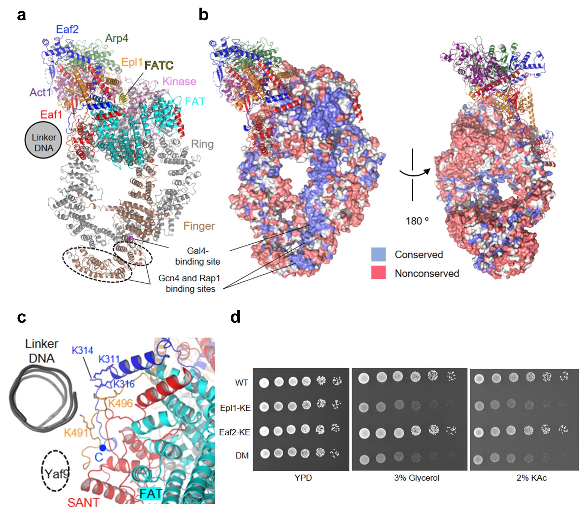 At the edge of the TRA module, a polybasic surface (PBS) formed by the Epl1 and Eaf2 subunits interacts with the linker DNA (Fig. 2b). The importance of the PBS was confirmed by the acetylation assays and the yeast genetic experiments (Fig. 2c).