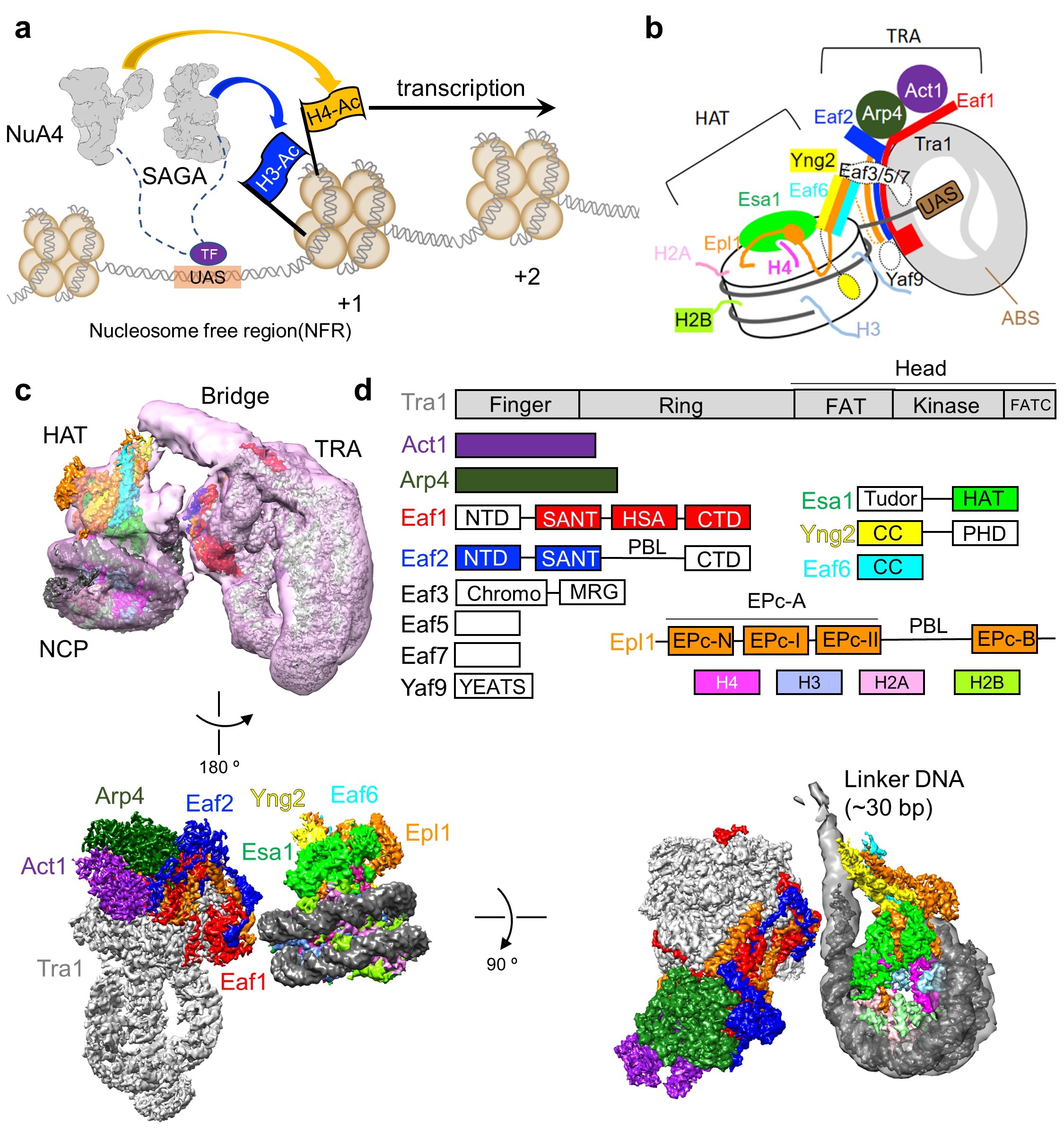 NuA4 and SAGA are two important histone acetyltransferases (HAT) in yeast, which preferentially acetylate the H4 and H3 tails, respectively (Fig. 1a). NuA4 and SAGA are highly conserved, and the former is the only essential HAT for yeast survival. Recruitment of NuA4 and SAGA to promoter regions relies on the shared subunit Tra1, which interacts with different transcription factors (TFs). Because of the fundamental importance, NuA4 has been studied for more than 20 years. However, the structural basic of NuA4 assembly and the association with nucleosomes remains poorly understood.