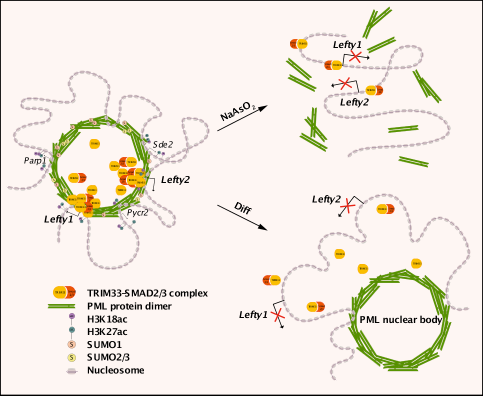 Working model for PML NBs recruitment of TRIM33 on Lefty1/2 transcriptional regulation in mESCs. PML NBs facilitate client protein TRIM33 localization to target gene loci in mESCs, and specifically serve as a hub for transcriptional regulation of Lefty1/2 directed by Nodal signaling.
