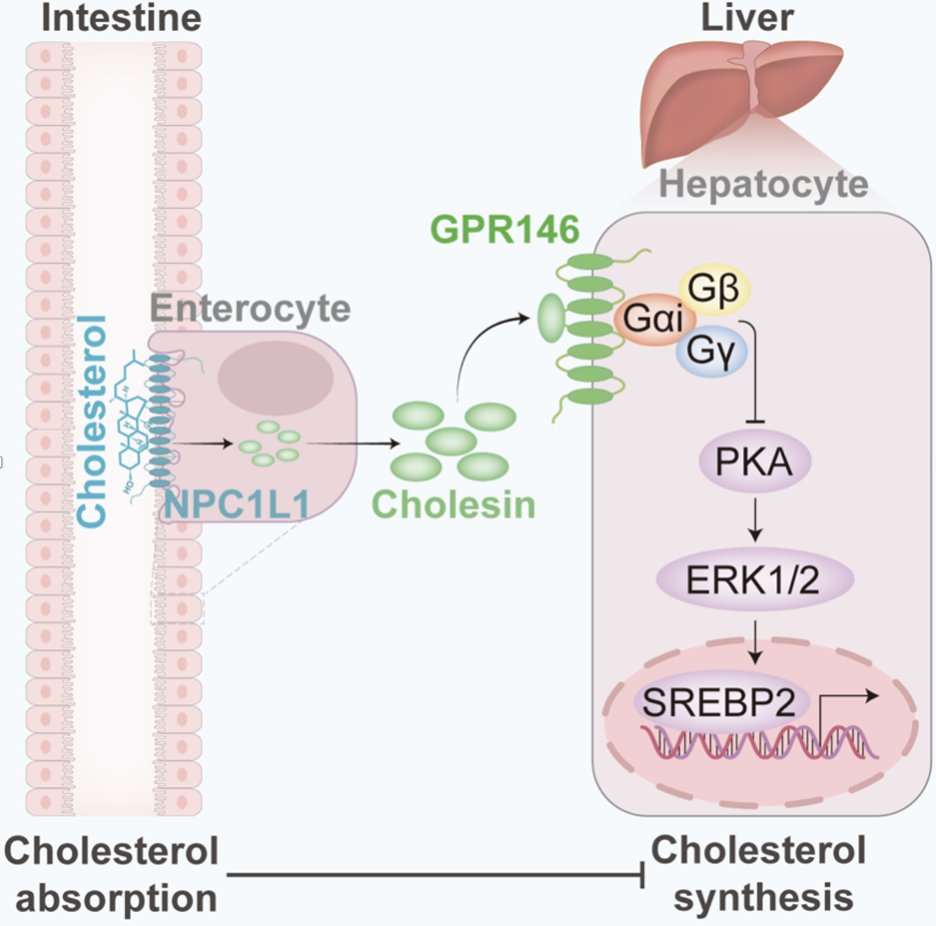 A Cholesin-GPR146 axis links cholesterol absorption in the intestine to inhibition of cholesterol synthesis in the liver, thereby providing protection against hypercholesterolemia and atherosclerosis.